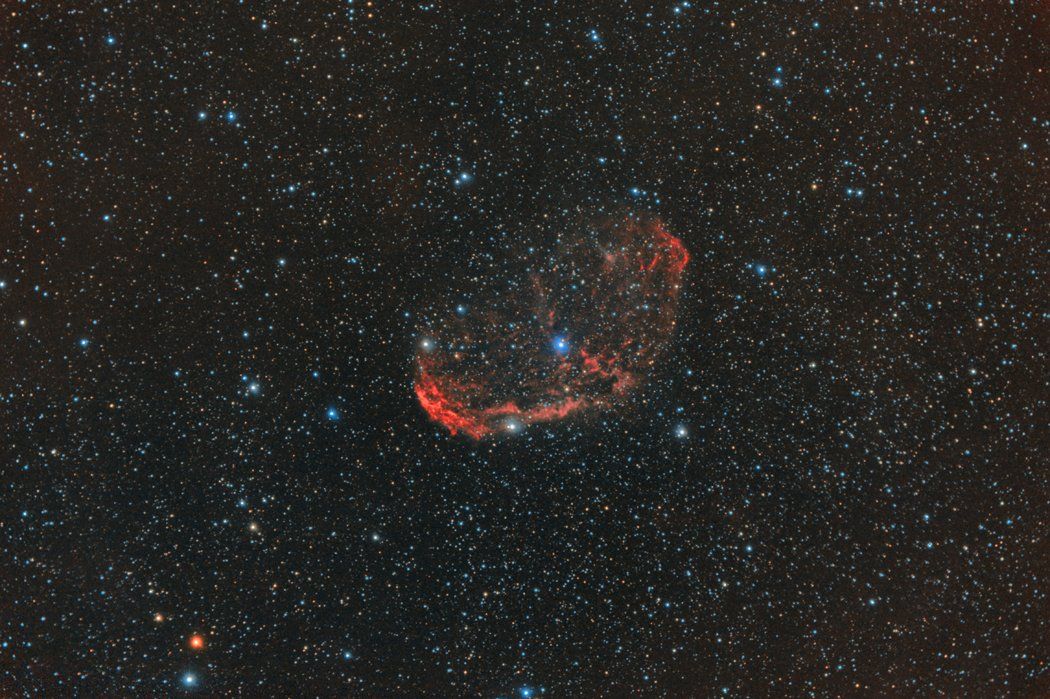 NGC 6888 (другое обозначение — LBN 203) — эмиссионная туманность в созвездии Лебедь.Размеры туманности составляют примерно 25 на 18 световых лет. Она располагается на расстоянии примерно 4700 световых лет от Земли. NGC 6888 образовалась в результате выбросов супергиганта HD 192163, расположенного в центре туманности. Масса этого светила составляет около 10 солнечных. Центральная звезда туманности NGC 6888 относится к классу звёзд Вольфа-Райе (WR 136). Эта звезда сильным звёздным ветром срывает с себя верхние слои оболочки, каждые 10 000 лет выбрасывая в пространство вещество, равное по массе нашему Солнцу. Сложная структура туманности скорее всего объясняется взаимодействием интенсивного звёздного ветра с веществом, сброшенным на более ранних стадиях. Звезда уже находится на последней стадии своей жизни и сжигает внутреннее топливо с непомерной скоростью. В конце концов она должна будет погибнуть в красочном взрыве сверхновой. Снято в сентябре 2014г. СТФ Мираж-8 + редьюсер 0,58 + кэнон 50д с клип-фильром GLS. сылка для просмотра большего изображения - http://foto-volochek.nethouse.ru/static/img/0000/0003/2142/32142204.lfwglace2m.jpg?1414769979Г