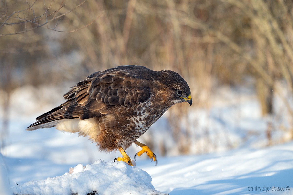 Сильные стороны: яркое освещение, чёткая фокусировка на птице, динамика в серии — от стояния до раскрытия крыльев. Хорошо передано поведение канюка в зимней обстановке.