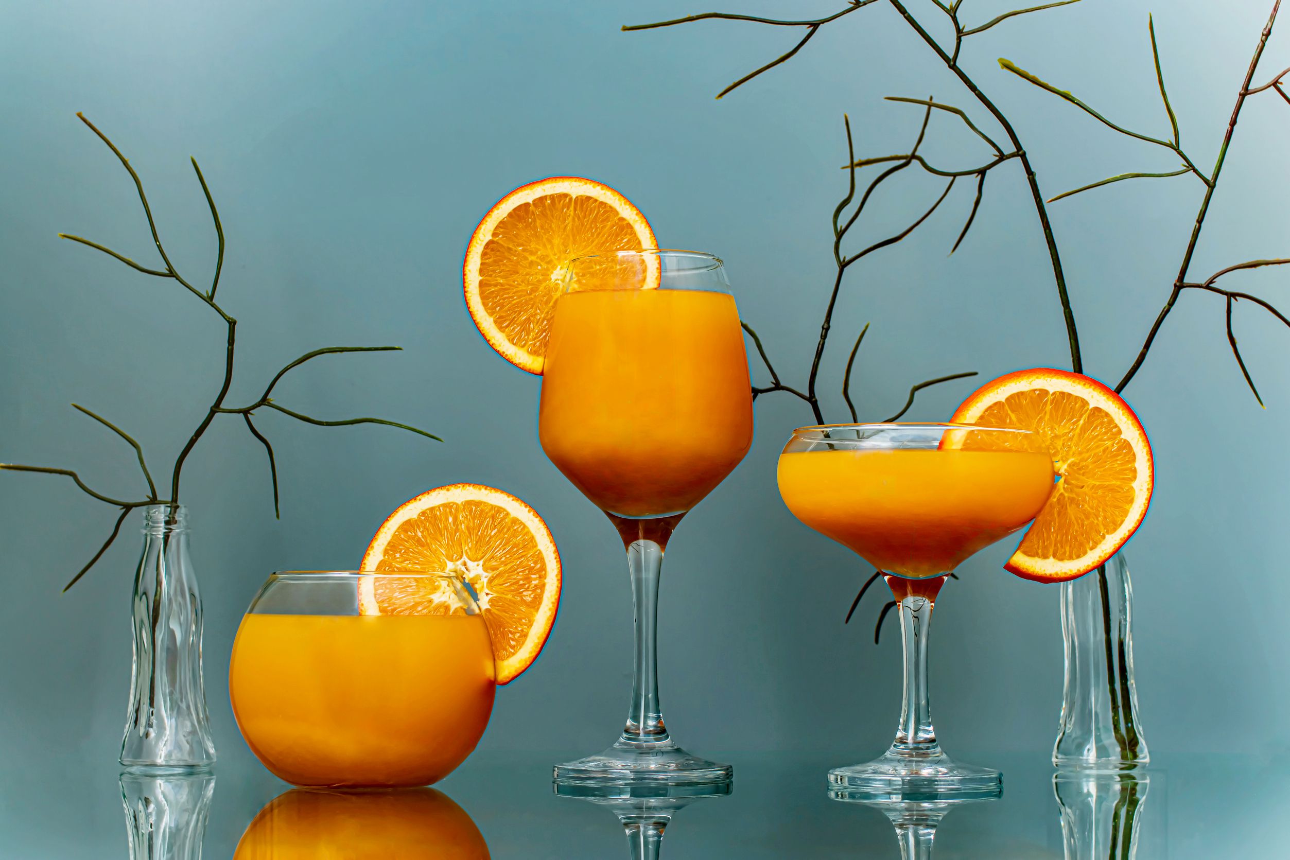 На изображении три бокала с оранжевым напитком - апельсиновым соком. Каждый бокал украшен долькой апельсина на краю. Бокалы стоят на зеркальной поверхности, отражая их и создавая симметрию. На заднем плане видны тонкие веточки в стеклянных вазах, что добавляет декоративный элемент к композиции. Фон изображения голубого цвета.