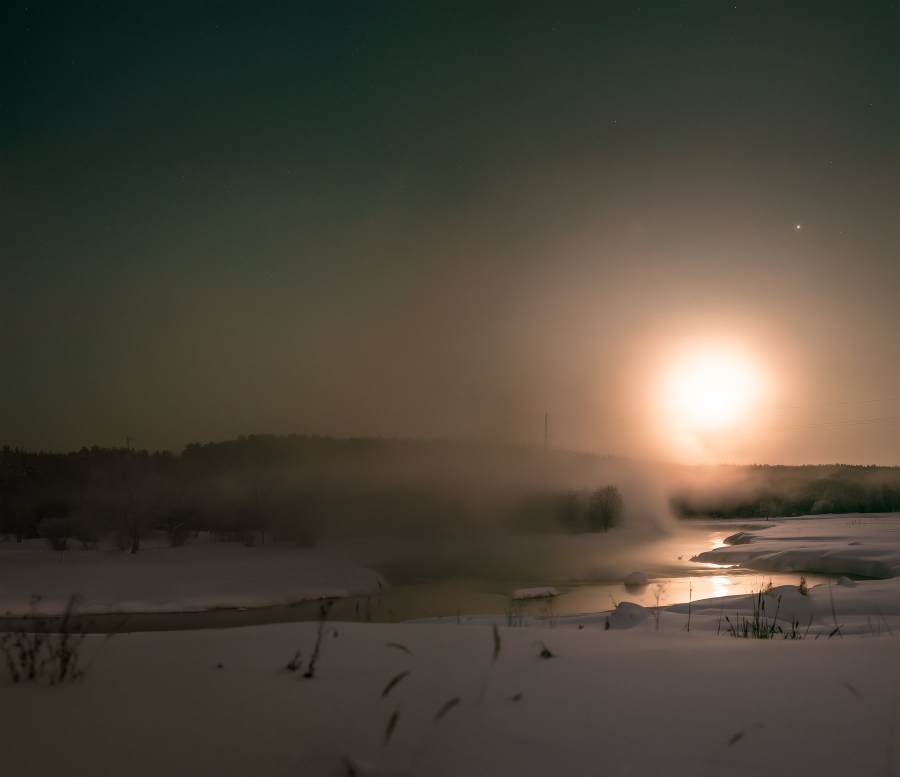 луна, ночь, пейзаж, река, туман, Влад Арт