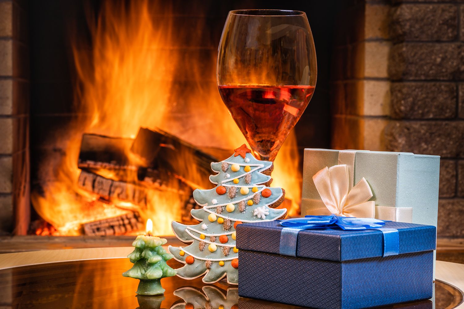 камин, огонь, Новый год, подарки, вино, Лариса Дука