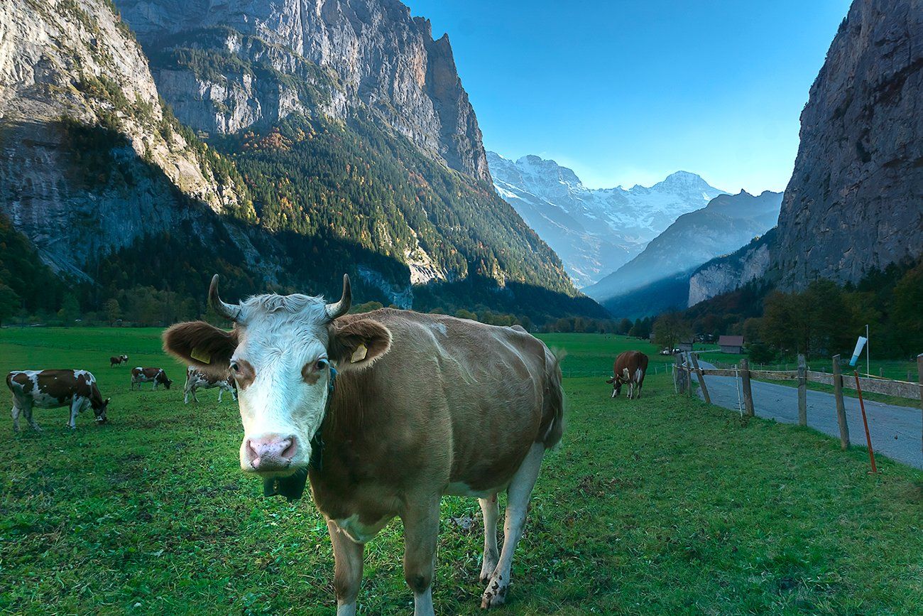 пейзаж, природа, долина, Лаутенбруннен, Швейцария, корова, Лариса Николаевна Дука