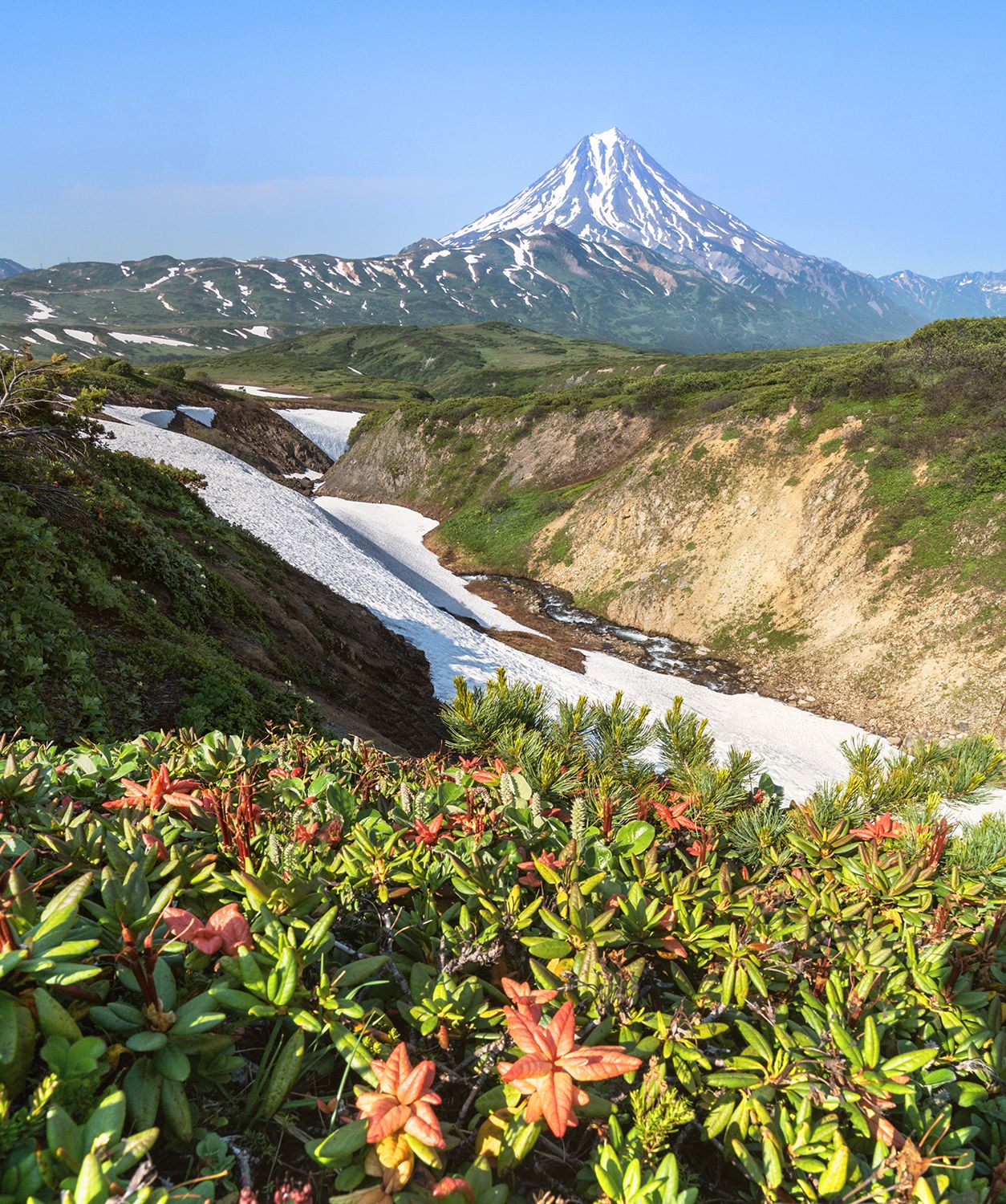 Замечательное сочетание цветов и снега на фоне стремительного вулкана!