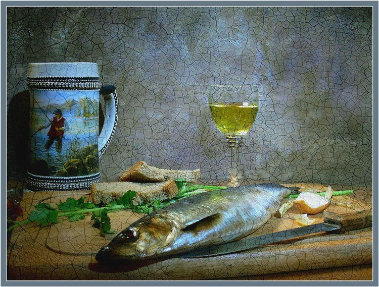 Согласен с Димой. Селедка супер, но рюмку хотелось бы на лафетник или уж на стакан водки поменять, хотя лучше всего подойдет советская пивная кружка. Фактура хоошая, если только на стене оставить и деформировать в стекле. Как бы на просвет.