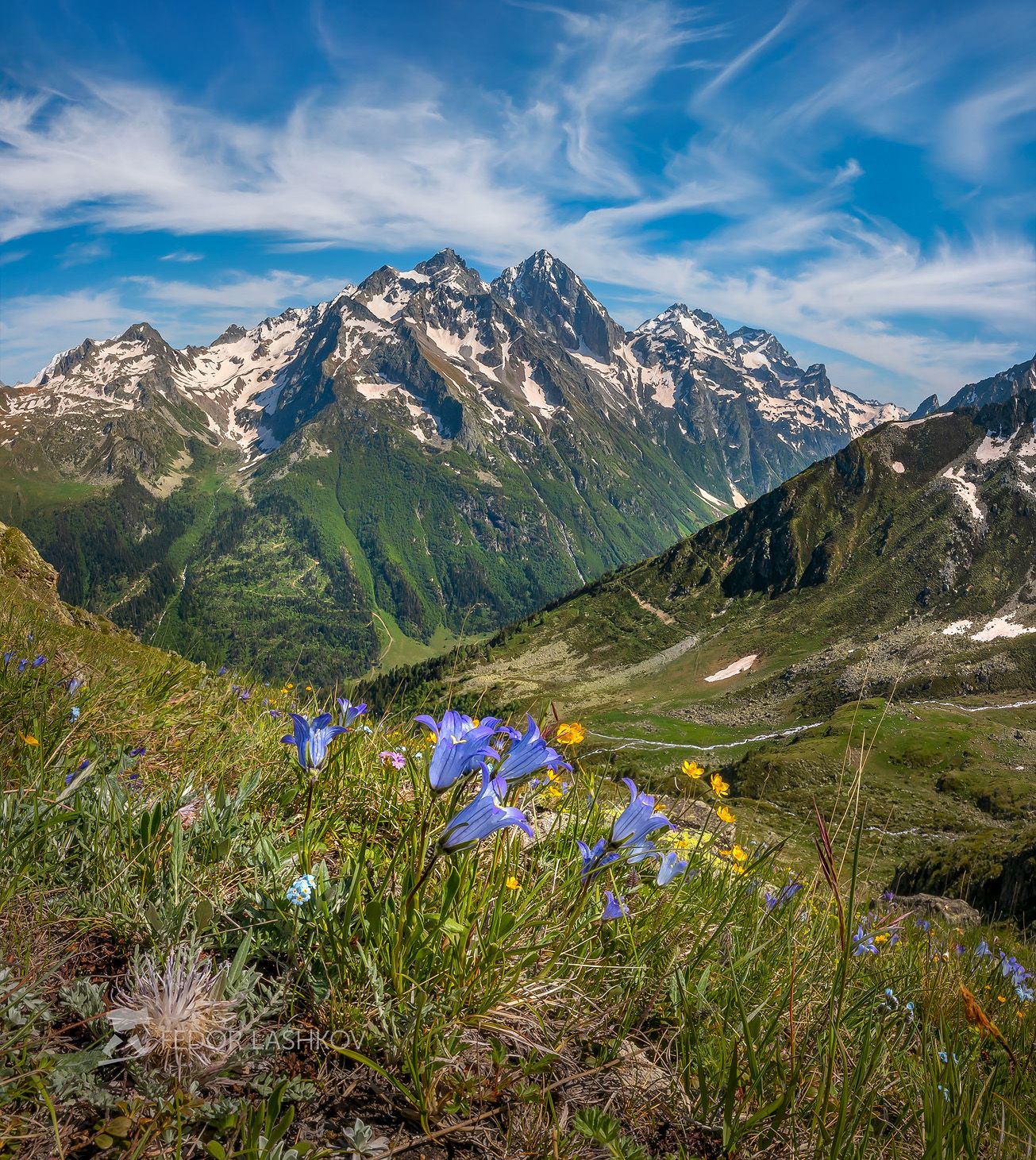 северный кавказ, путешествие, горы, горное, хребет, колокольчики, цветы, лето, цветение, луг, облака, днём, день, летнее,, Лашков Фёдор