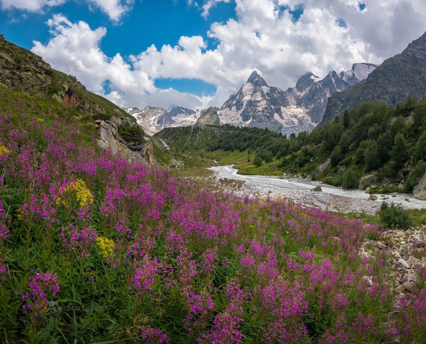 северный кавказ, горы, гора, вершина, путешествие, туризм, хребет, цветы, цветение, луг, лето, река, облака, иван-чай, открытка, Лашков Фёдор