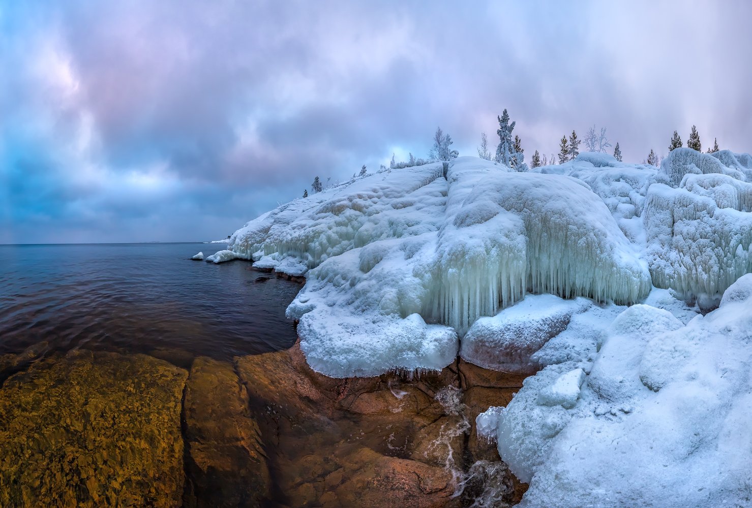 Погода была в основном пасмурная, но на рассвете и в сумерках небо живописно расцветало, давая возможность создавать поэтичные фотоработы. Все-таки Ладожские пейзажи поражают своим масштабом и прекрасны в любую погоду. Меня поразили ледяные глыбы и наросты на шхерах и заснеженные и обледеневшие деревья. Ладога умеет удивлять!