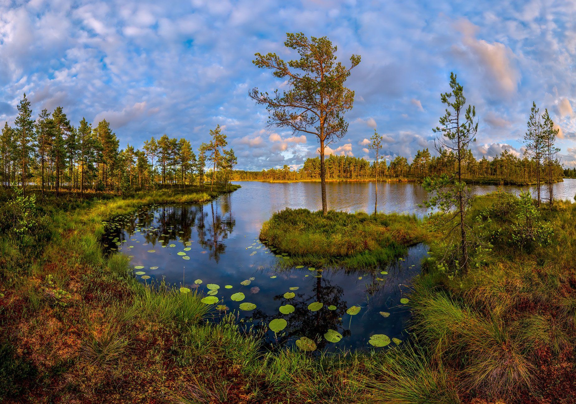 ленинградская область, болото, сосна, остров, озеро, закат, кувшинки, отражение, облака, мох., Лашков Фёдор