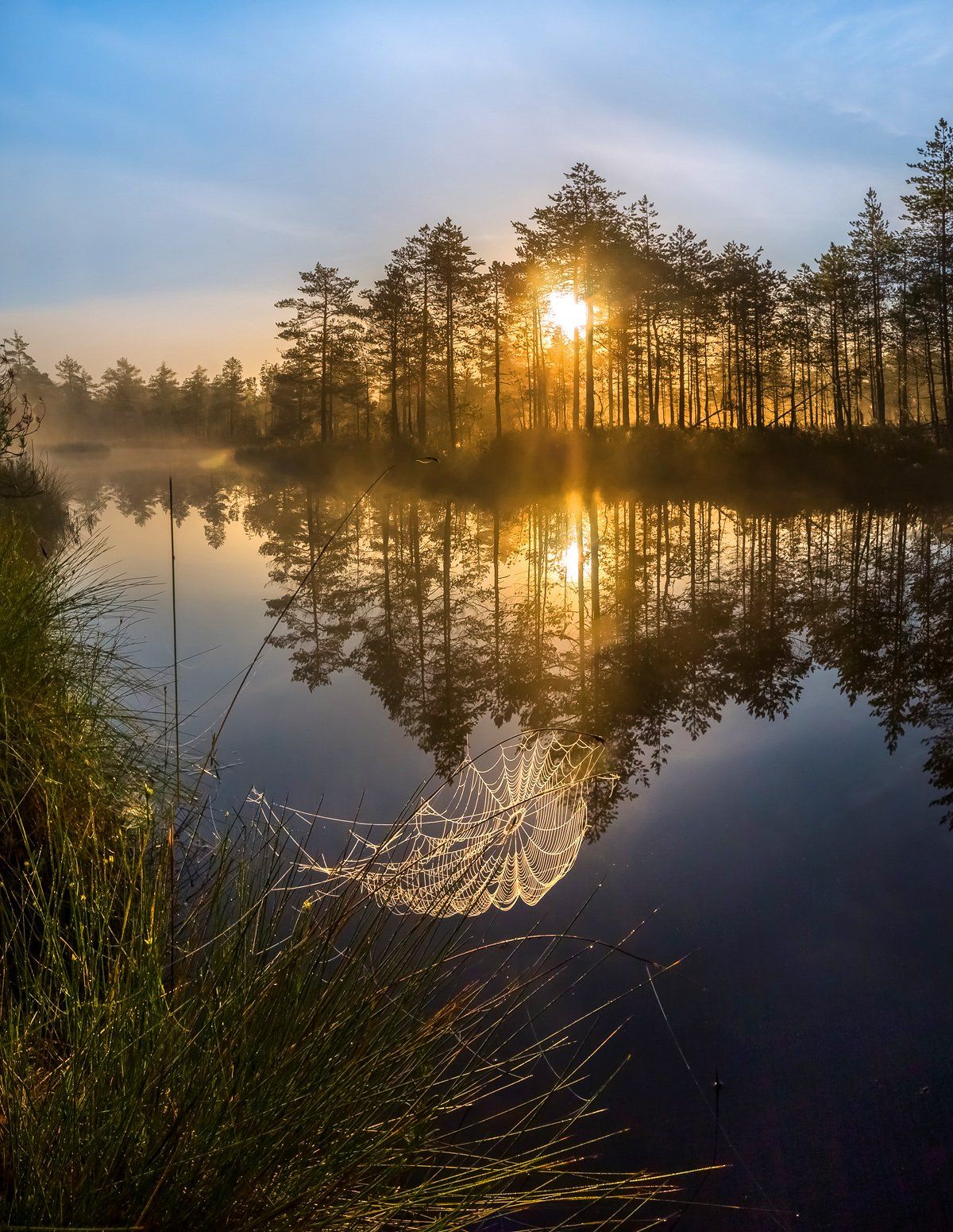 Летний туманный рассвет на болотистом озере.