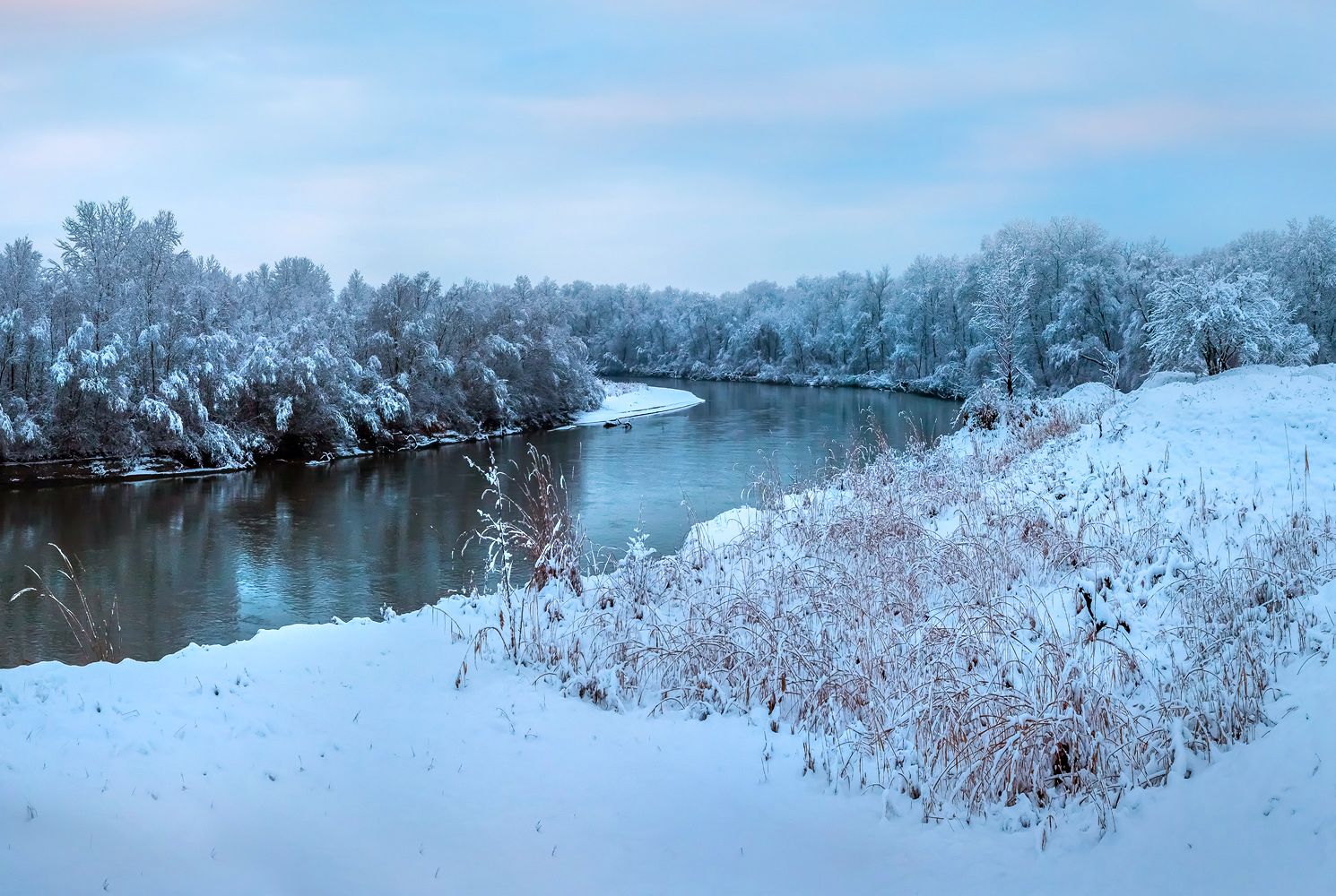 Зимний рассвет после ночного снегопада.