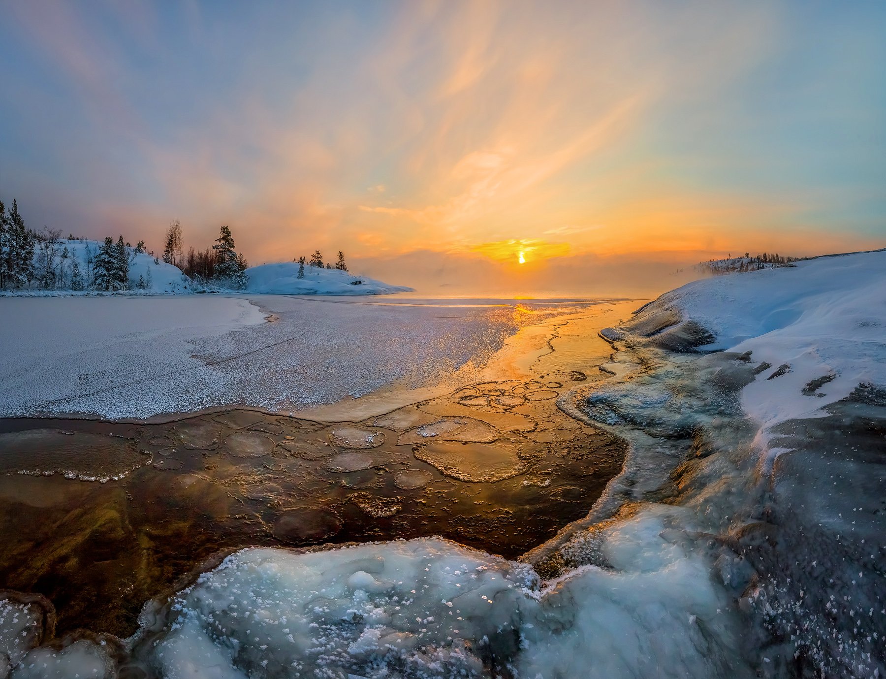 После ночного похолодания, стал формировать и застывать узорами первый лёд. Этот момент самый интересный и живописный для съёмки, так как ещё не сплошное, белое поле льда.