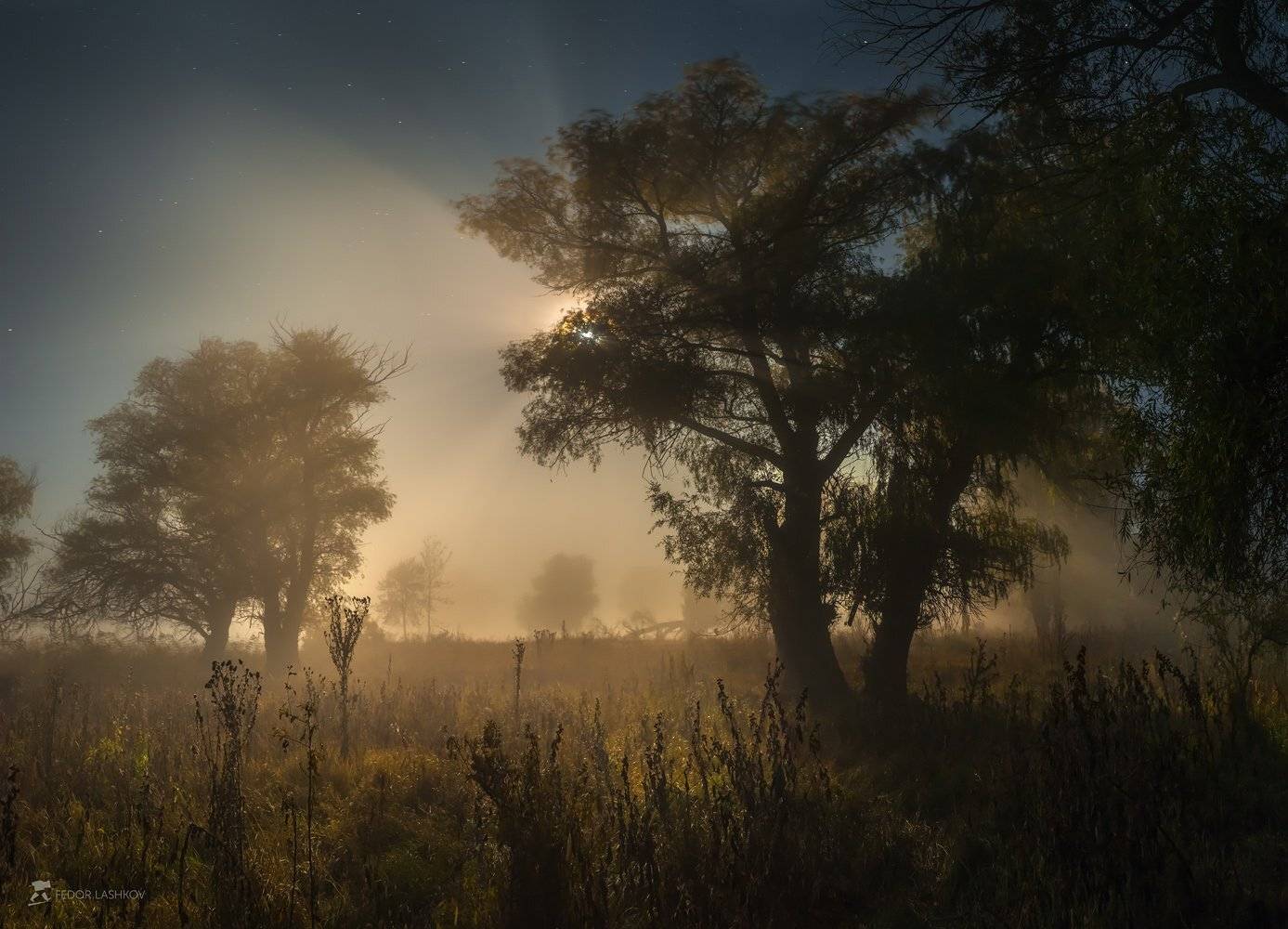 Туманное полнолунье. Веер над ивой от света яркой луны.
