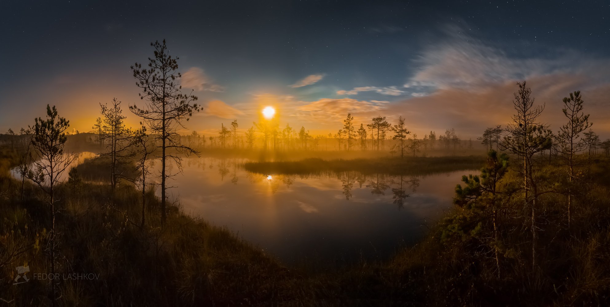 Летнее полнолунье на болотно-озёрном комплексе. Луна только поднимается, поэтому, плюс ещё сквозь туман, свет её оранжево-золотой. Буквально через 15-20 минут, когда луна поднимется выше над атмосферной дымкой, оттенок света станет холодно-белым. Всегда, если есть прогноз на туманную ночь, я стараюсь фотографировать ночные пейзажи до того как луна поднимется высоко, чтобы поймать очень редкий момент – золотой лунный свет, такой оттенок бывает, только если густой туман уже стелется по земле.