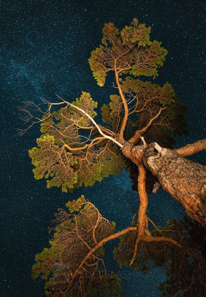 сосна, ночь, ночное, дерево, ствол, звёзды, млечный путь,, Лашков Фёдор