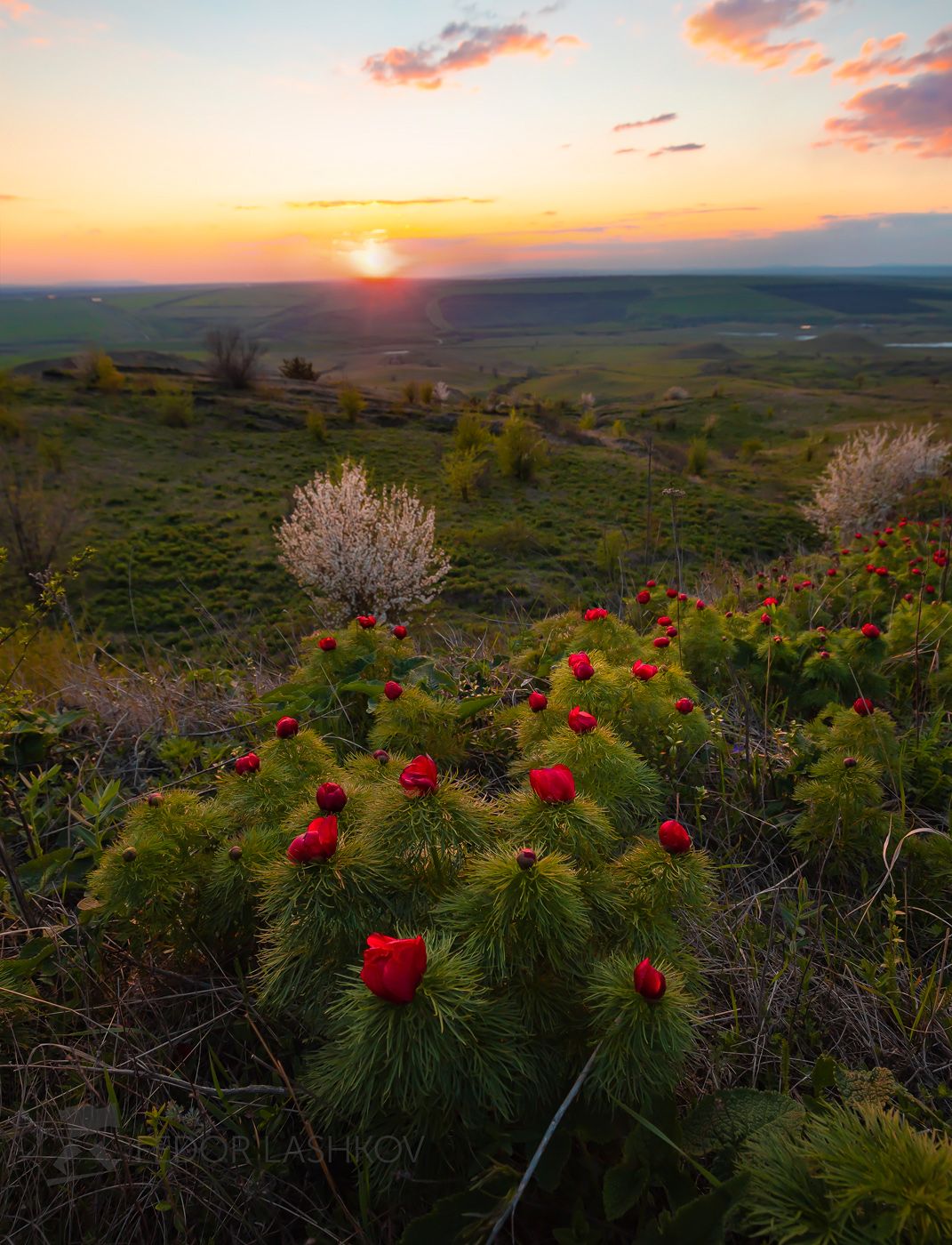Цветёт пион узколистный, или пион воронец (лат. Paeonia tenuifolia). Занесён в Красную книгу России.