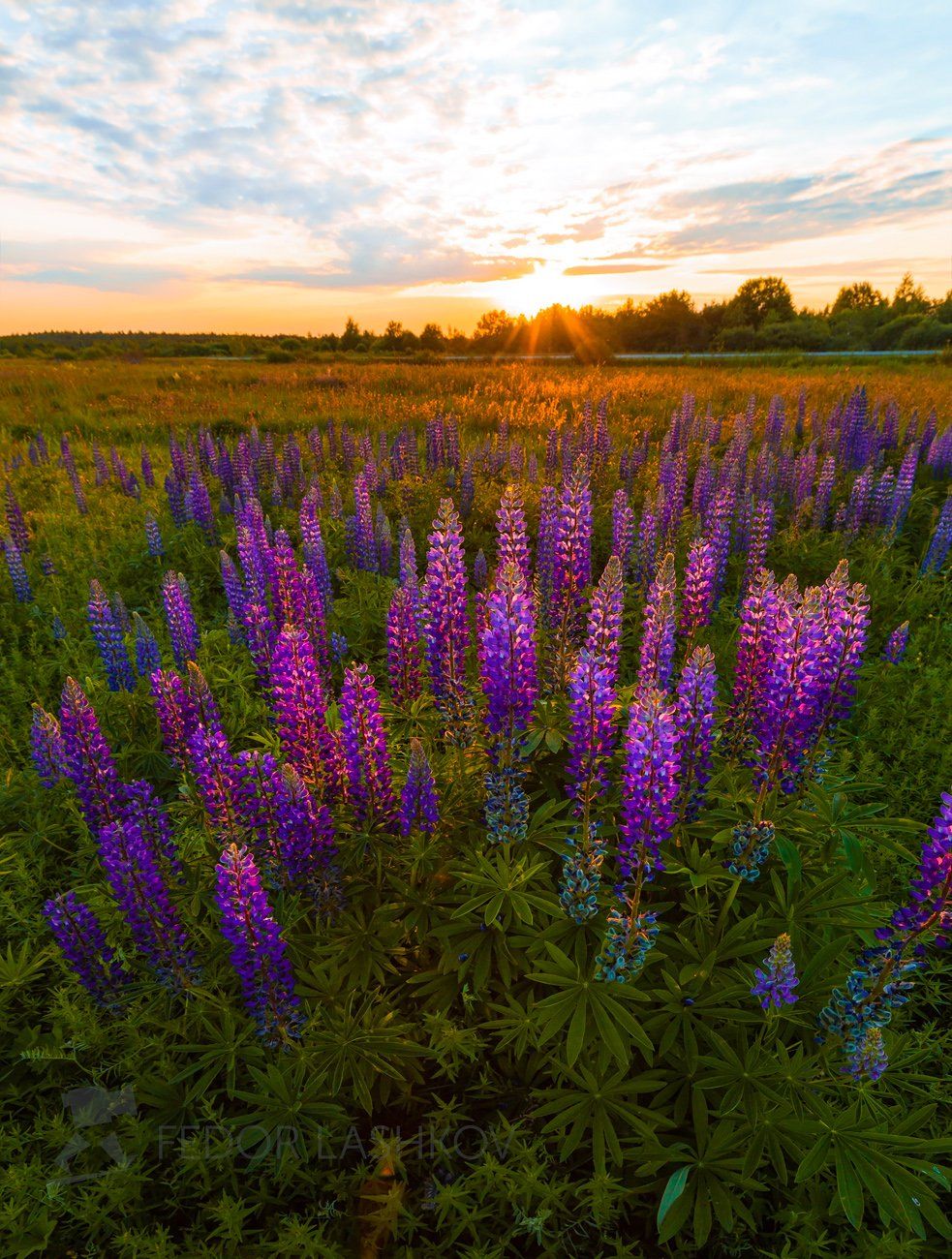 ленинградская область, закат, цветы, люпин, люпины, луг, лето, цветущее,, Лашков Фёдор