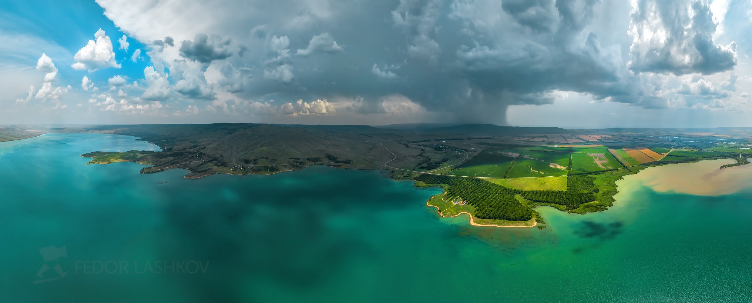 Изумрудное Сенгилеевское озеро в лучах солнца и грозные тучи летней непогоды. На горизонте, ливень заливает гору Недреманная.