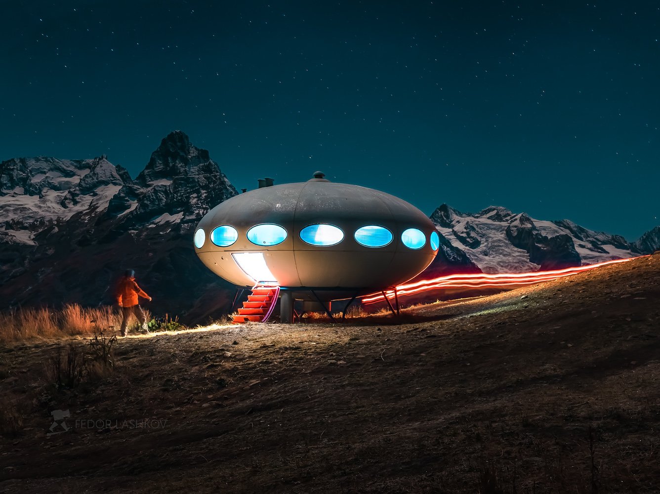 НЛО под ночным небом в горах Домбая. Трап гостеприимно открыт, чтобы завлечь и похитить любопытного туриста.