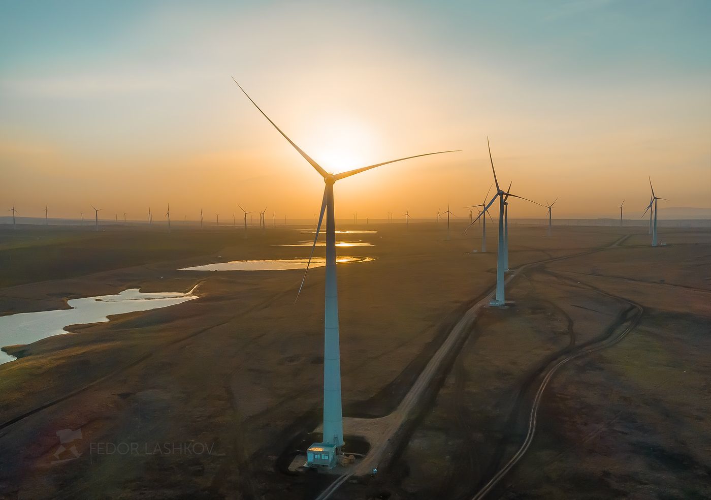 Вот и в этот раз, от фирмы поступил заказ – поснимать подъём и установку лопасти для строящеюся Кочубеевской ветроэлектростанции (ВЭС). Моя задача была снять сам процесс работы, технику и нужно было постараться сделать фотографии красочные, живописные, в моём стиле, для оформления офиса компании. Так как этот сложный процесс работы должен происходить в безветренную погоду, то, в этот день подъём начался в 6 утра (был полный штиль), за час до рассвета. И осенний красочный рассвет помог мне! Снимки получились, так как было нужно! На 7-м снимке видно сам момент состыковки 50-ти метровых лопастей с башней на высоте 150 метров.