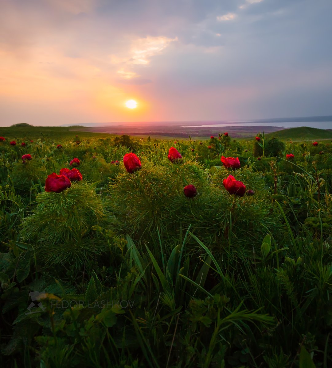 Цветёт пион узколистный, или пион воронец (лат. Paeonia tenuifolia). Занесён в Красную книгу России.