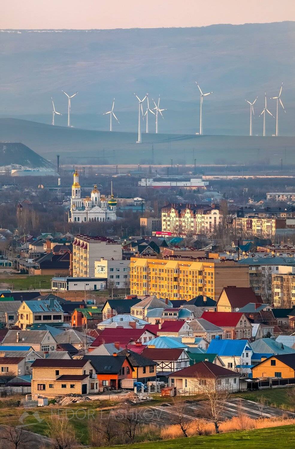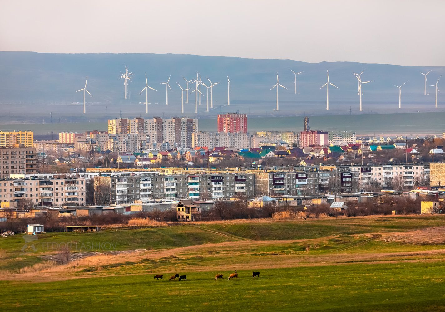Весенние краски и золотое освещение от заката на домах города. На заднем плане, на фоне горы Стрижамент, Кочубеевский ветропарк (ВЭС).