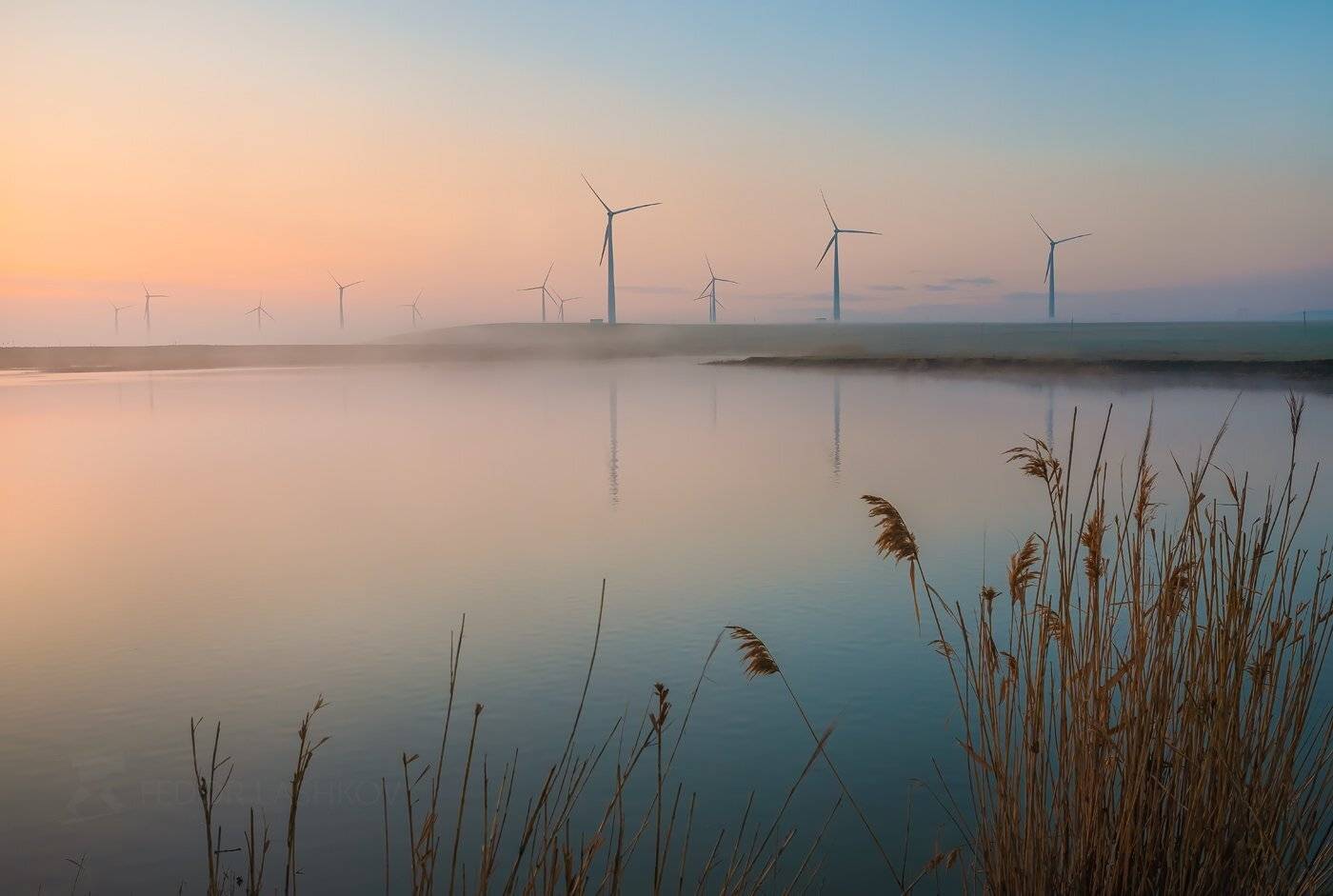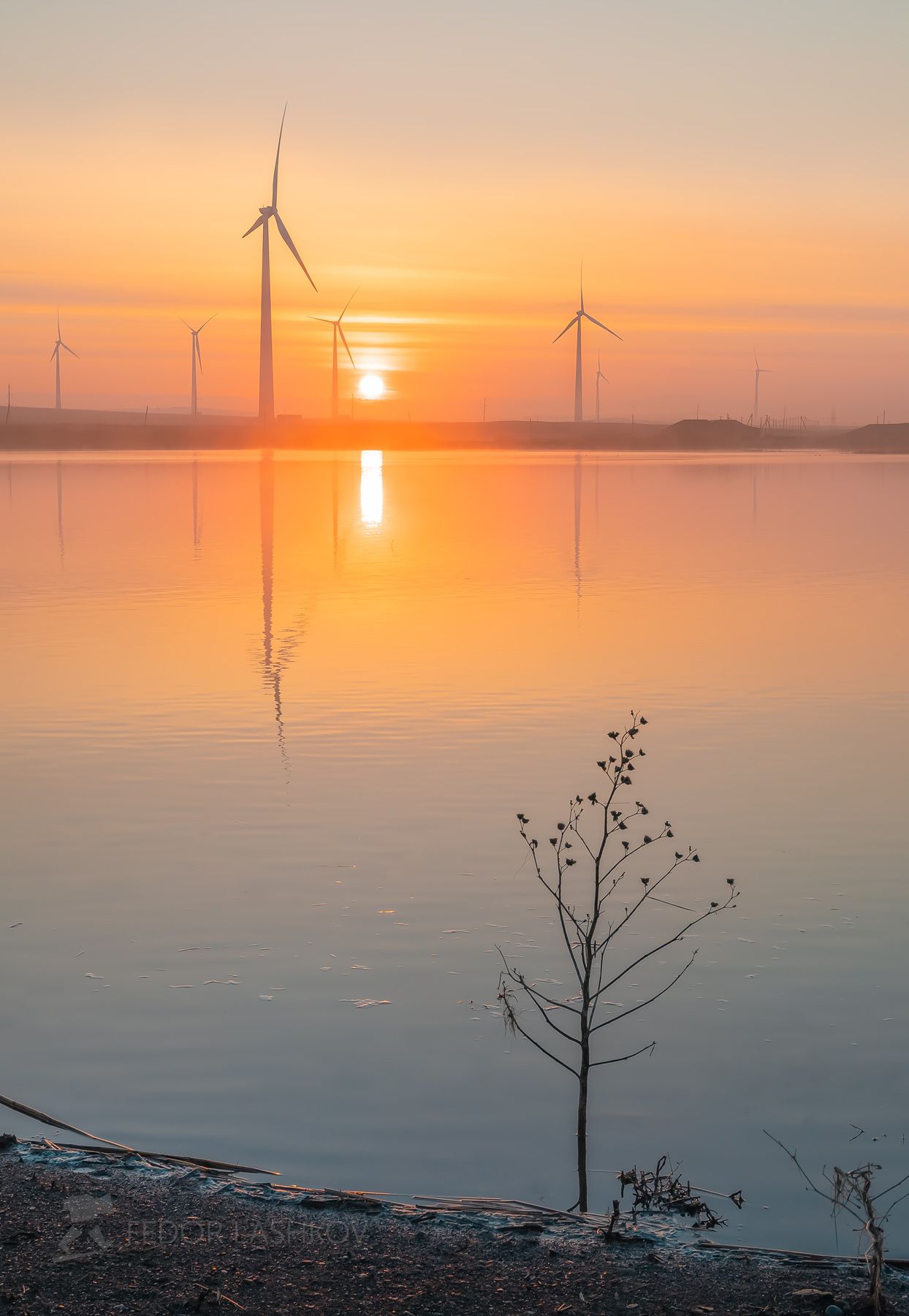 Туманный рассвет в ветропарке Кочубеевской ВЭС.
