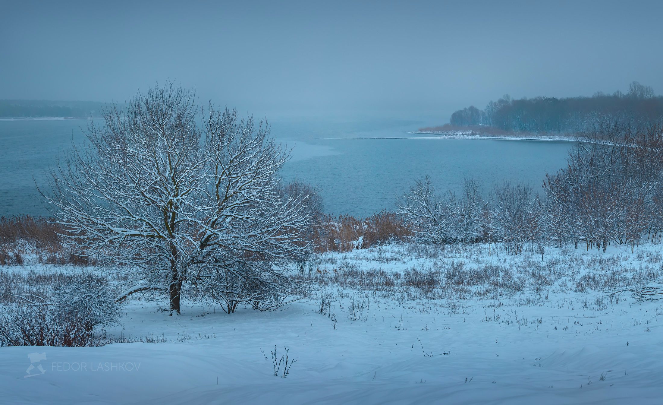 белгородская область, белогорье, зима, зима22, зимнее, первый снег, снежное, в снегу, белгородское водохранилище, водоём, озеро, пасмурно, вода, мыс, берег, сосна, одно дерево, синий, белый,, Лашков Фёдор