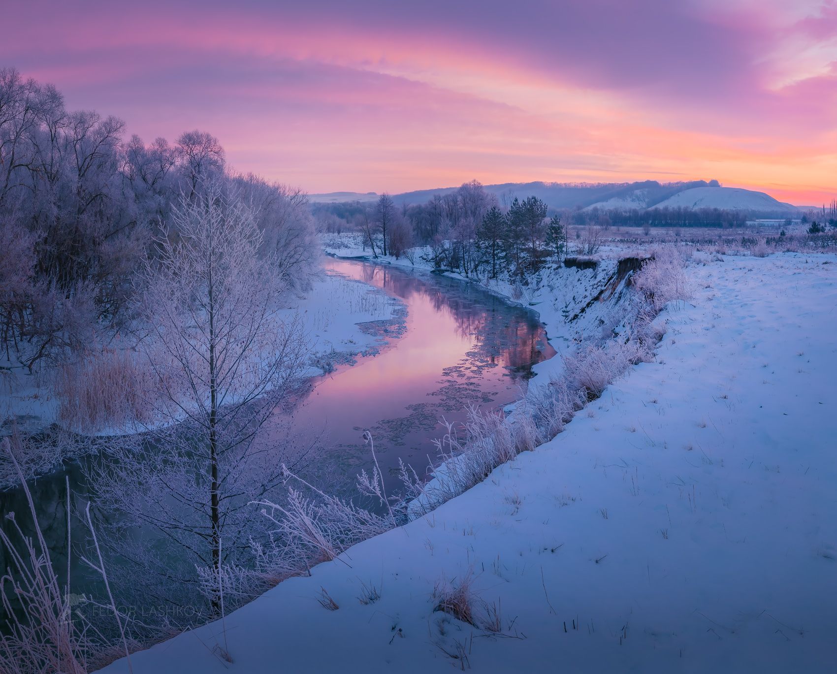 белгородская область, белогорье, зима, зимнее, снежное, белое, синий, заря, рассвет, небо, красочное, река оскол, речное, берег, течение, лёд, иней,, Лашков Фёдор