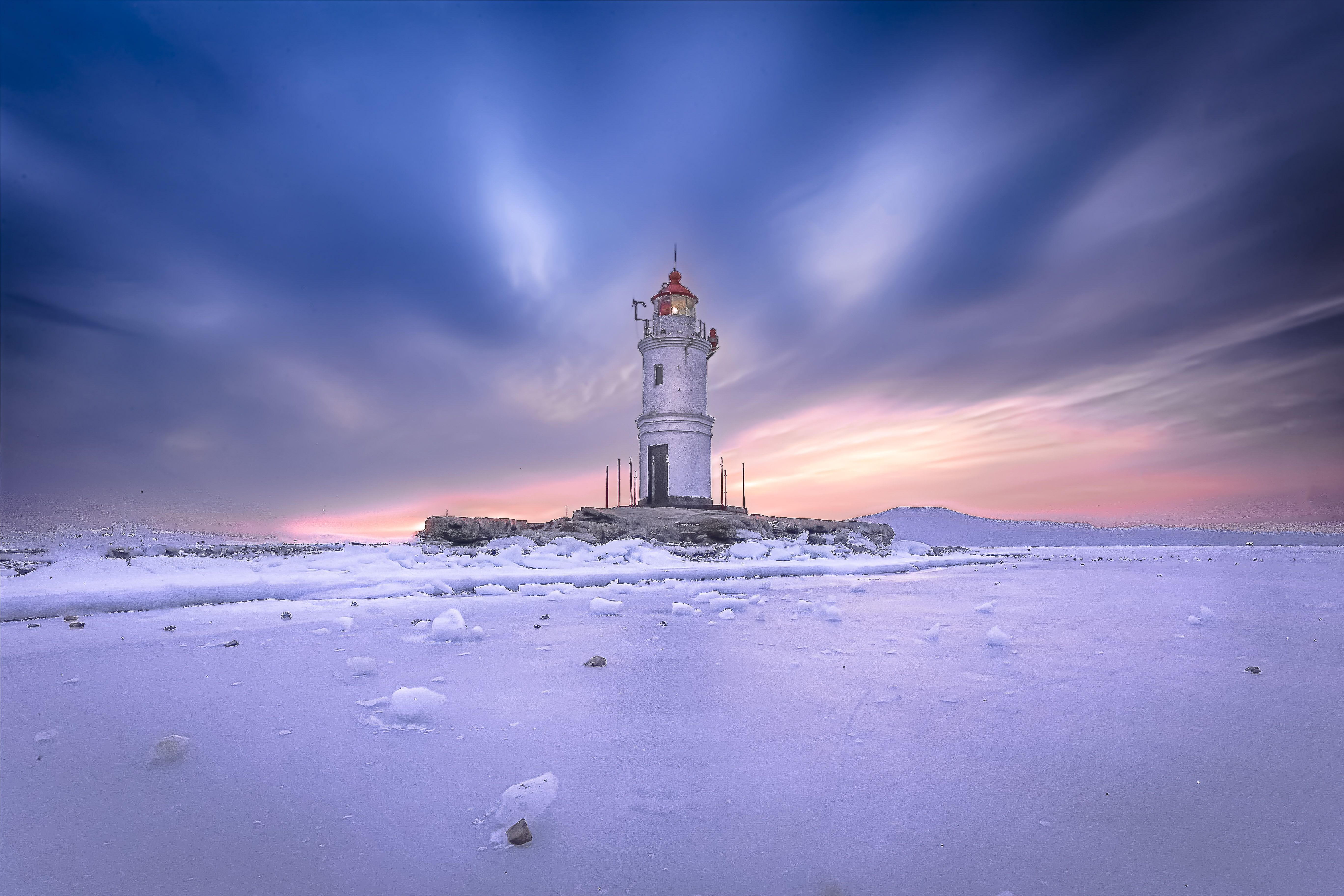 Вспышка отделяет льды от неба. Следующий проблеск через 10 ударов сердца. Между: тишина, предрассветные сумерки и скованное февралем Японское море. Розовеет горизонт: нежная пастель переливается через сопки и заполняет все вокруг. Маяк на кошке Токаревского гаснет.