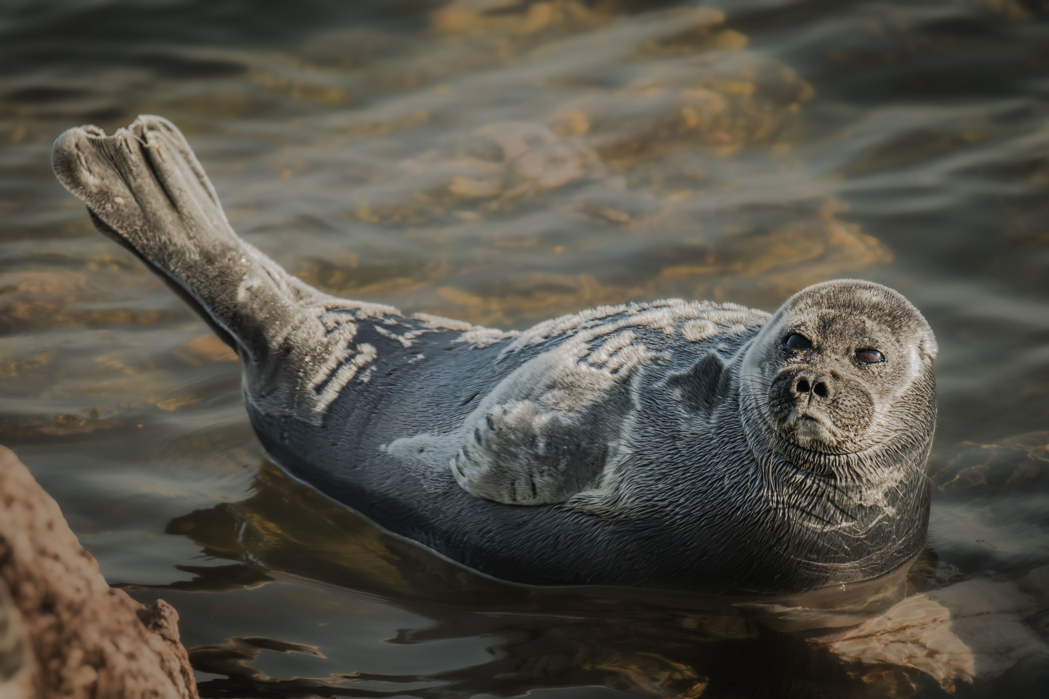 Снимок получился живым и естественным — тюлень смотрит прямо в камеру, будто задумался, а вода вокруг мягко играет светом. 🐾