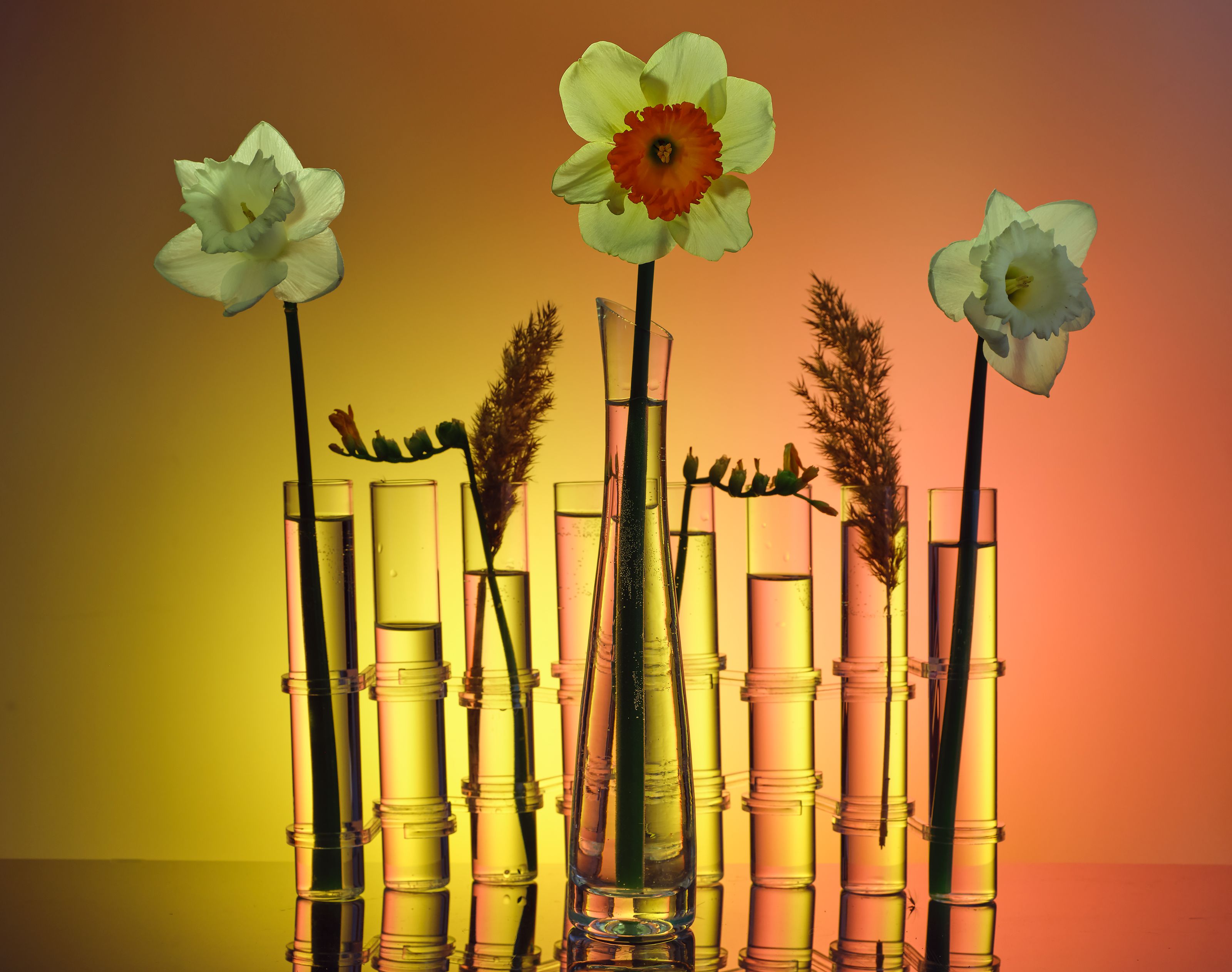 Центральным элементом композиции выступает высокая узкая ваза с ярким нарциссом — её форма и цветовой акцент притягивают взгляд, создавая визуальный фокус, вокруг которого строится вся композиция. Выбор света и оттенков подчёркивает изящество и контраст между геометрией стекла и органичностью цветов.