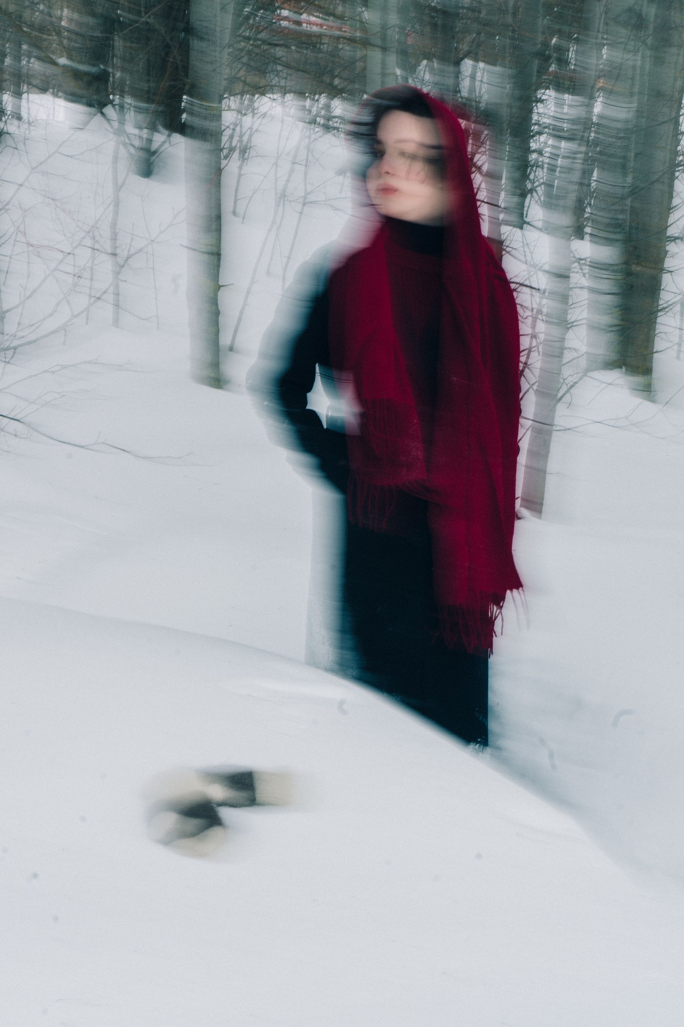 снег, черное пальто, длинная выдержка, красный акцент, лес, девушка в черном, Елена Леонидовна