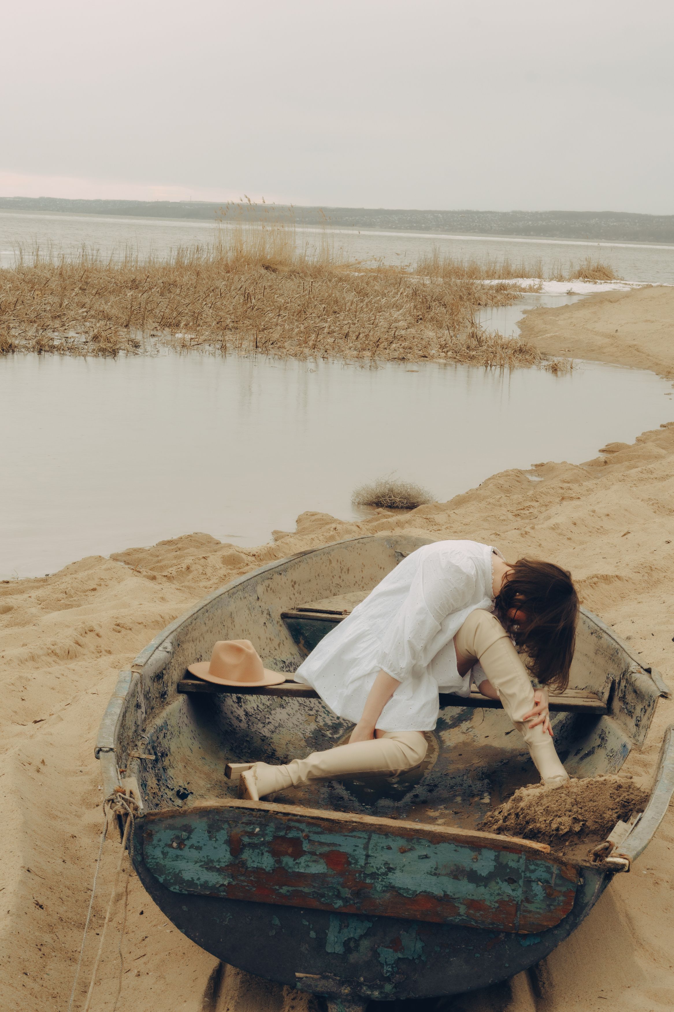 деревянная лодка, берег реки, лодка на берегу, девушка в белом, старая лодка, Елена Леонидовна