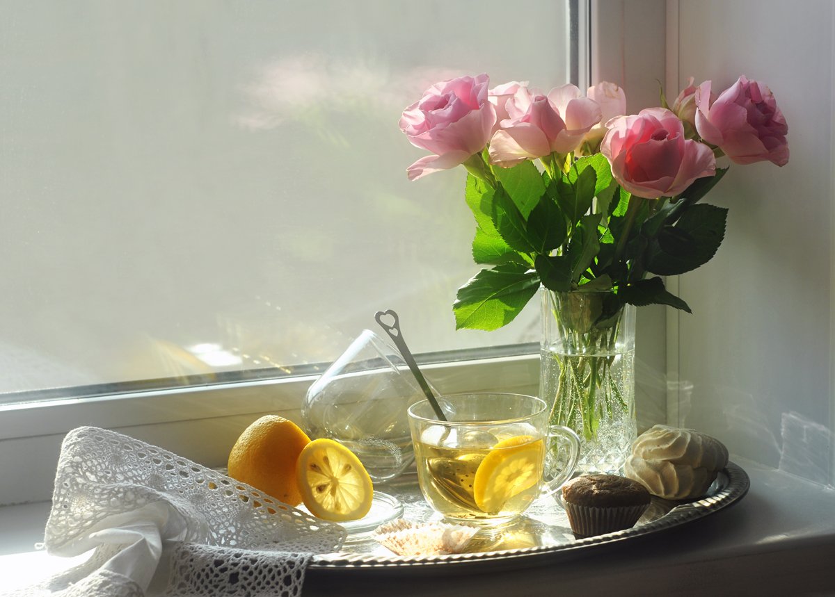 утро, розы, окно, солнечно, чай, лимон, натюрморт, Elena Pankova