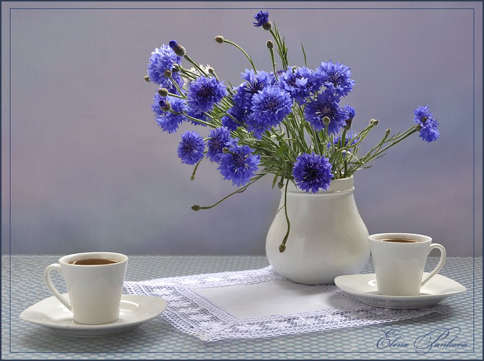Ennél a kimagasló alkotásnál Elena nagyon "kevésből" igen sokat hozott ki, melyre csak a legnagyobb fotóművészek képesek. A képen egy harmónikus emberi kapcsolat látható tisztaságban, reményben és kifinomult, szép környezetben, amit az asszony valósított meg. A kivasalt fehér terítő, a szép váza a kék búzavirágokkal és a mellette lévő csésze azt a légkört mutatja, amit az asszony létrehozott. Teljesen egyértelmű, hogy a bal oldalon lévő csésze a férfi számára lett odatéve, ami nincs elszakadta a terítőtől, csak egy kicsit távolabb van. Most meg lehetne kérdezni, hogy a két csésze miért nincs közel egymáshoz a terítőn ? Azért nincs, mert így a fotós teljesen kiemelte a női pozitív szerepét a kapcsolat megteremtésében és színvonalában. Az alkotás világszínvonalú!