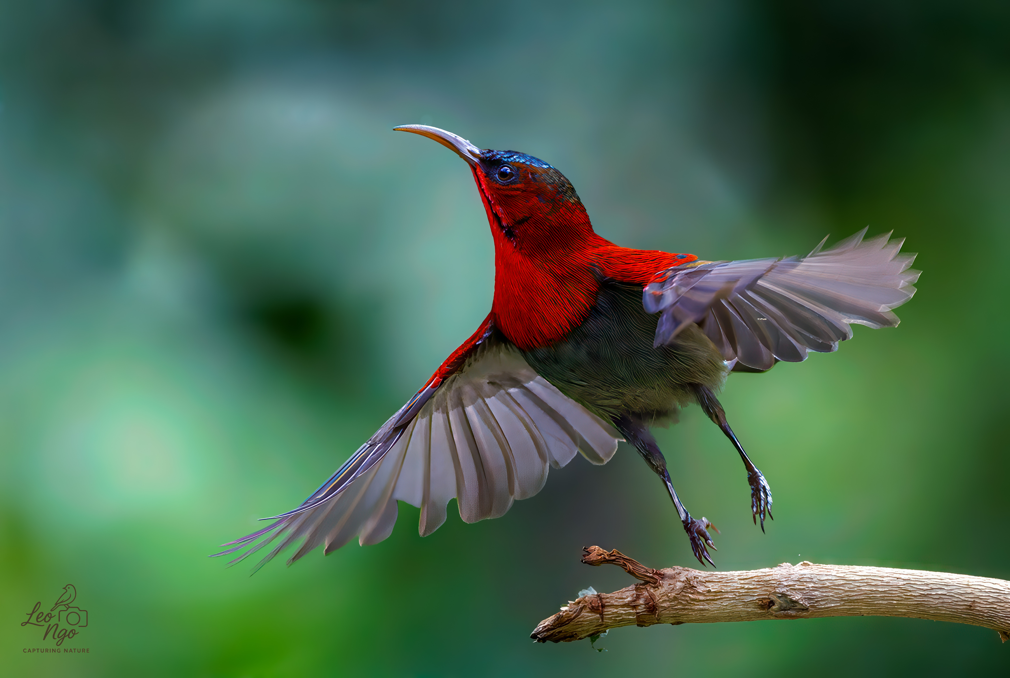 Красный солнечный колибри, захваченный в момент взлёта, демонстрирует изящество и динамику. Ярко-красное оперение на фоне размытой зелени подчёркивает красоту тропической птицы. Фотография передаёт мгновение, когда птица отрывается от ветки, раскрывая крылья и готовясь к полёту. Снимок отражает гармонию природы и мастерство фотографа в захвате быстрых движений.