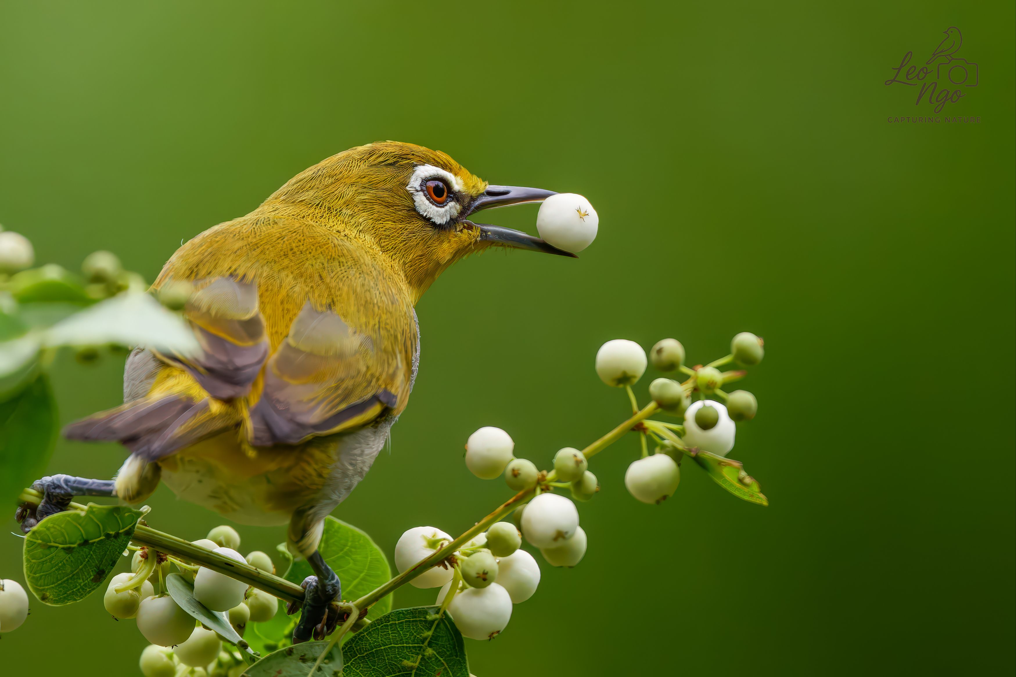 На снимке запечатлена птица, вероятно, из семейства ткачиковых, с оливково-жёлтым оперением и белыми глазами, сидящая на ветке с белыми ягодами. Она держит одну из ягод в клюве, что указывает на кормёжку. Фон мягко размыт, акцентируя внимание на птице и ягодах. Снимок передаёт естественное поведение в дикой природе. Фотограф Ngo Leo запечатлел момент с высокой детализацией и естественным освещением.