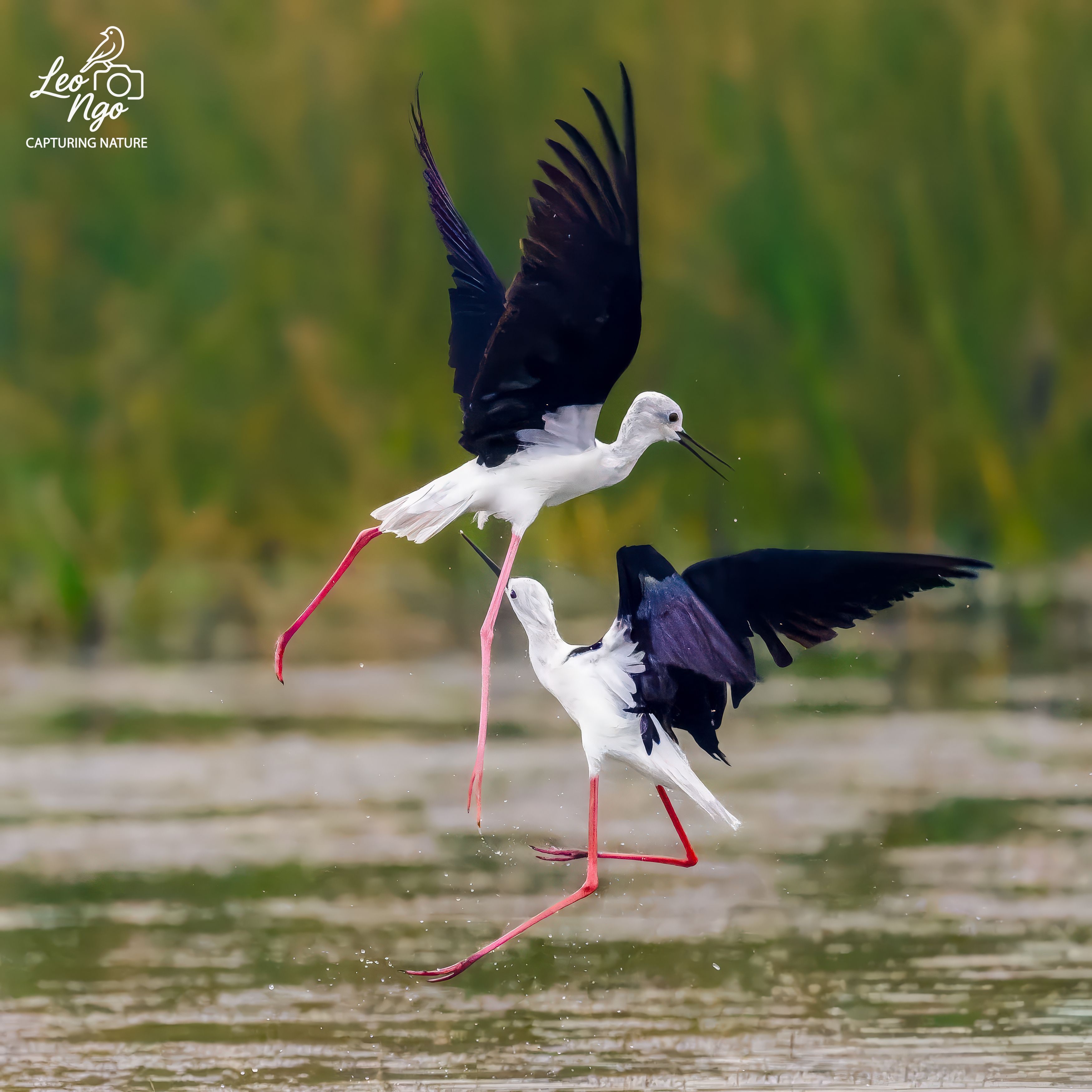 Sharp moment — two black-winged storks mid-action, wings spread, legs trailing, water kicking up. The motion is clean, the focus tight on the birds, and the green blur behind keeps them front and center. You really nailed the timing here.