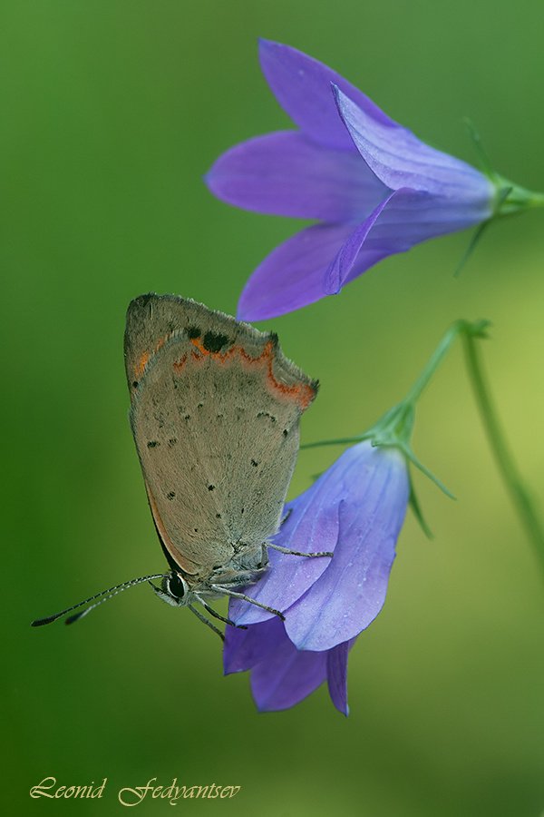 Самка огненного червонца (Червонец огненный (лат. Lycaena virgaureae, англ. scarce copper) — дневная бабочка из семейства голубянок) отдыхает на луговых колокольчиках.