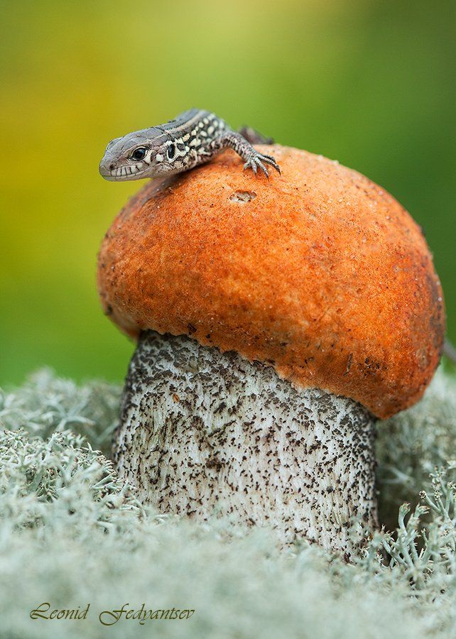 Молодая прыткая ящерица (лат. Lacerta agilis) пытается разглядеть фотографа из-за шляпки подосиновика красного (лат. Leccinum aurantiacum). Снимок сделан ранним утром 31 августа 2014 г.в сосновом лесу, поросшем лишайником – кладония лесная (лат. Cladonia arbuscula) в Борском районе Нижегородской области.
