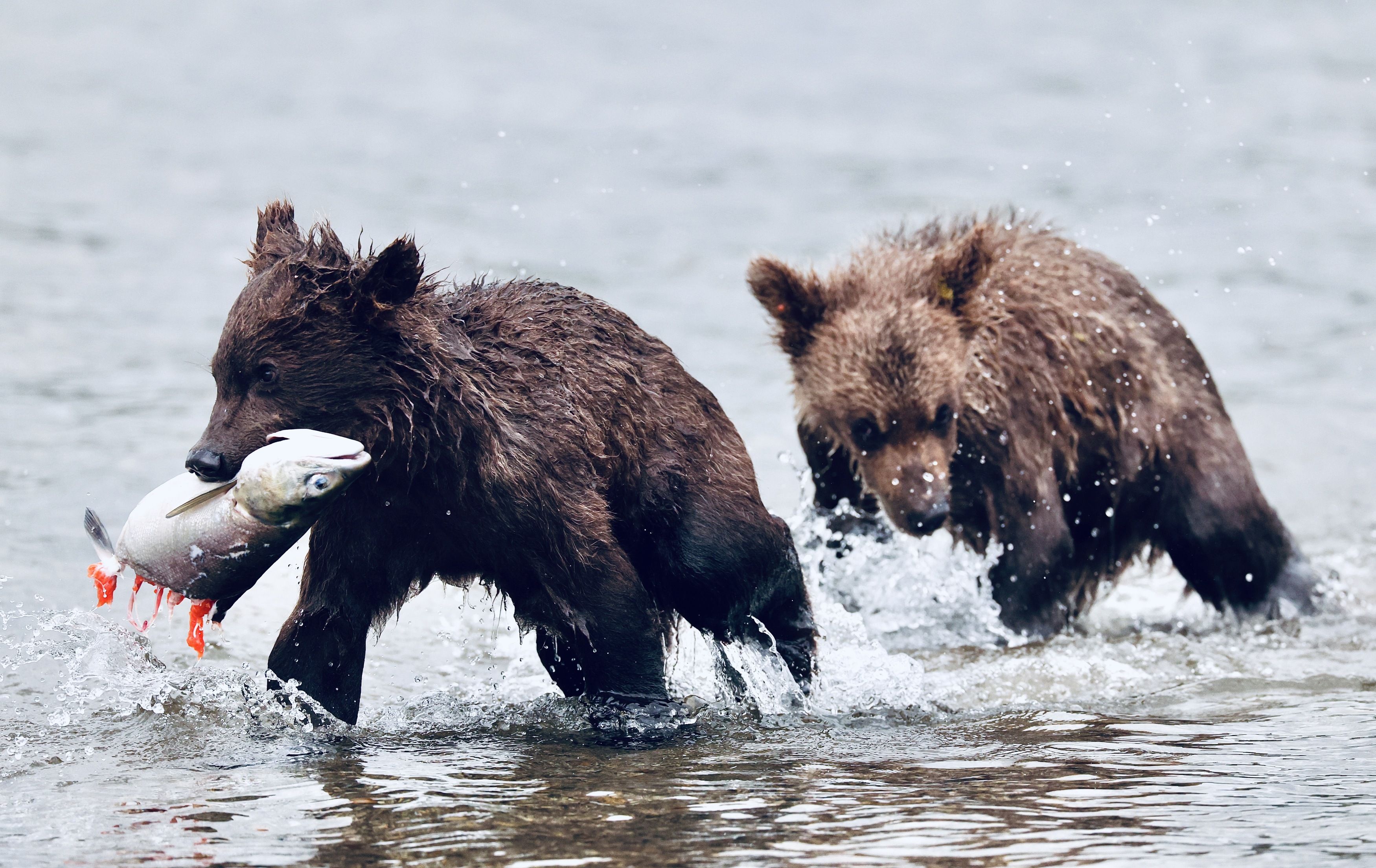 Вы, Леонид, уловили динамику момента — медвежонок с рыбой в зубах, бегущий сквозь брызги, и второй, настигающий. Как удалось зафиксировать такой кадр? Были ли в этот момент другие медведи вблизи?