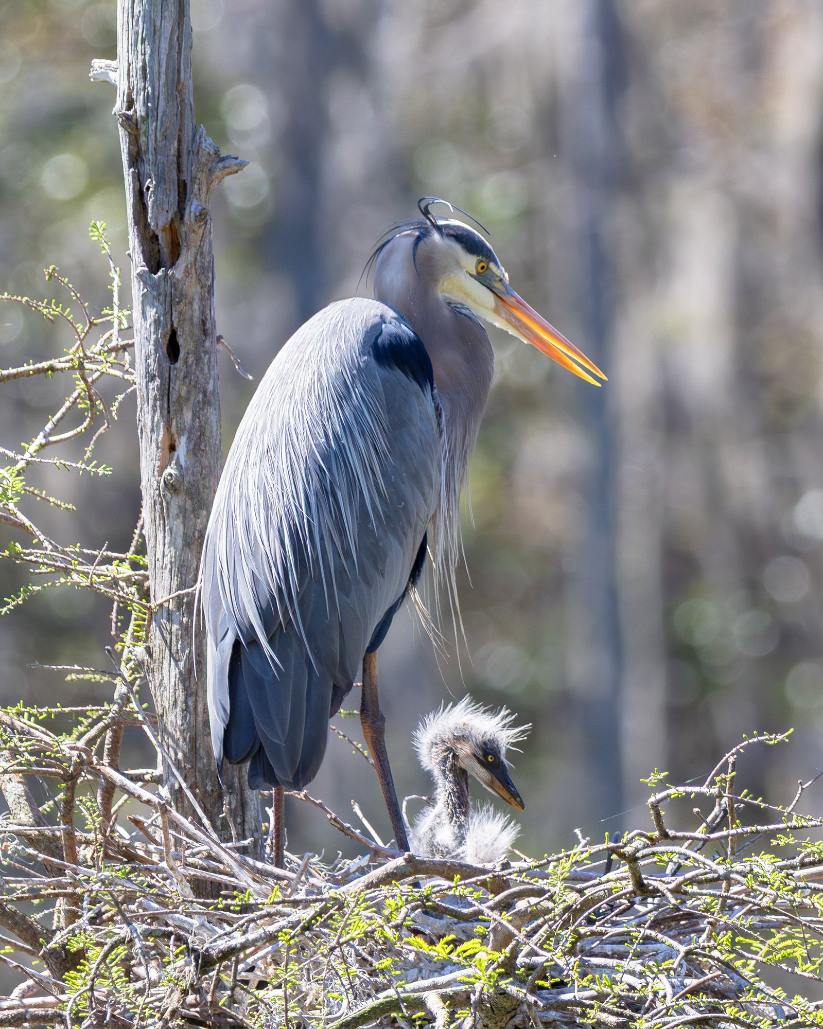 На снимке запечатлен серый аист — крупная водоплавающая птица — в гнезде, построенном из веток среди деревьев. Рядом с ним — маленький птенец с пушком, ещё не способный летать. Сцена передаёт заботу и естественный цикл жизни в дикой природе. Фотография сделана в условиях естественного освещения, подчёркивающего текстуру перьев и детали гнезда.