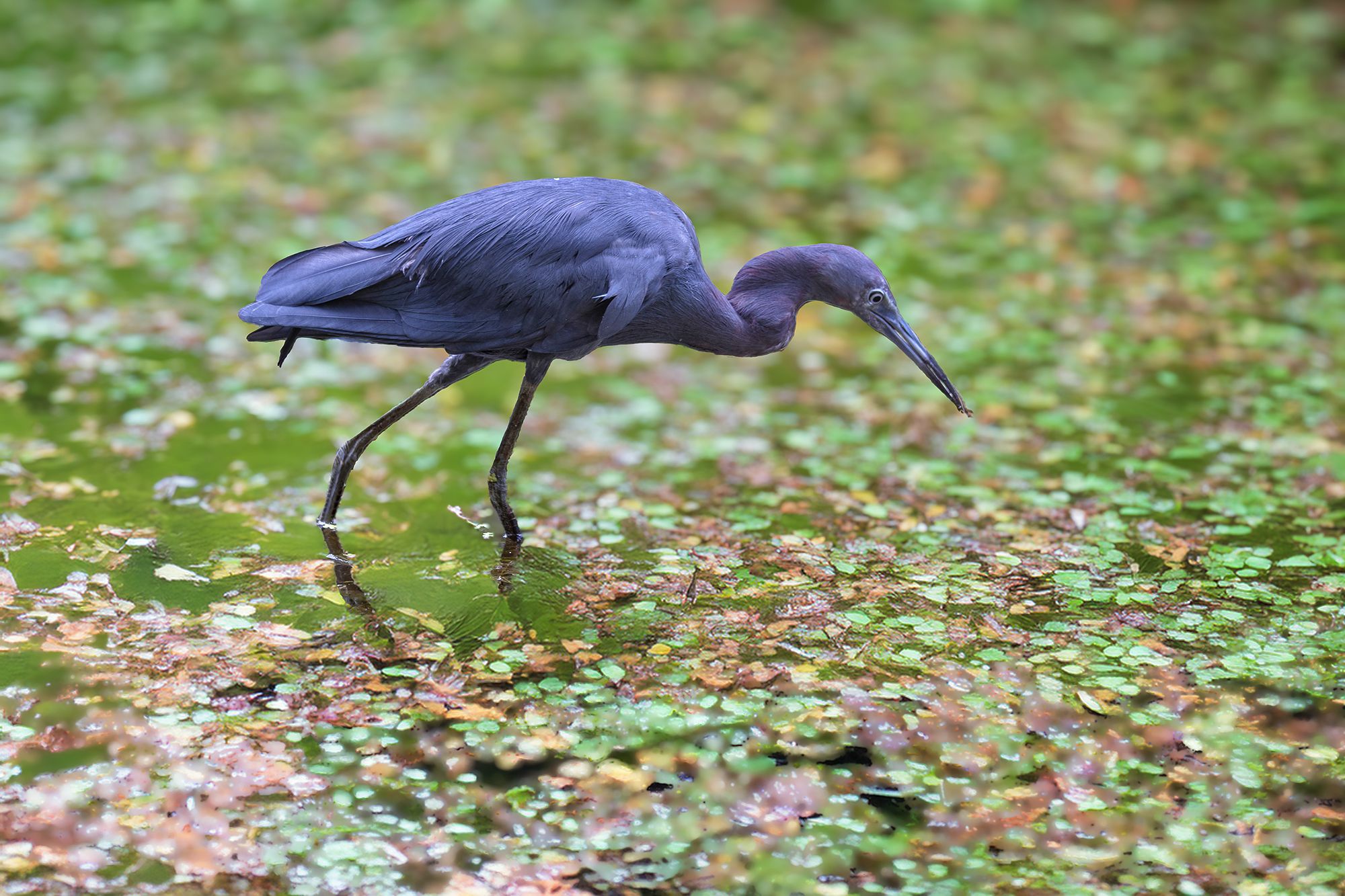 Взрослые цапли становятся равномерно тёмно-синими с фиолетовым отливом.