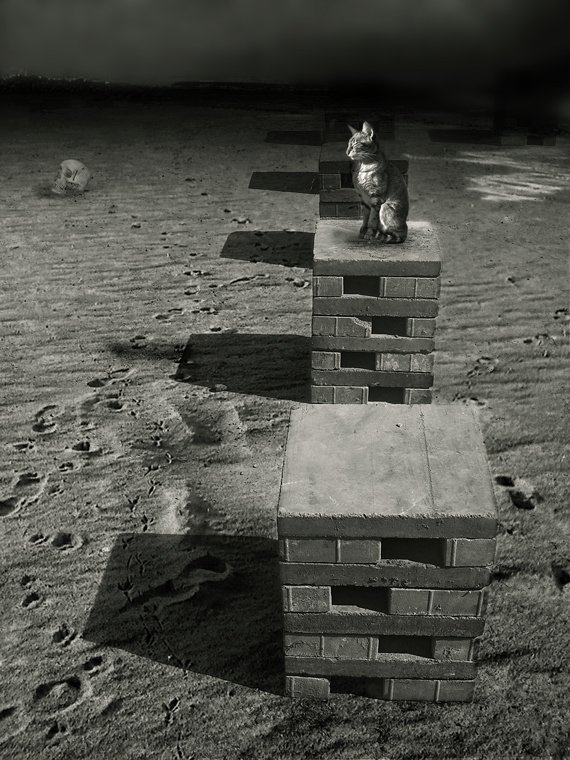 Интересно! Но не согласен с освещением на кошке..противоположно теням от кирпича...