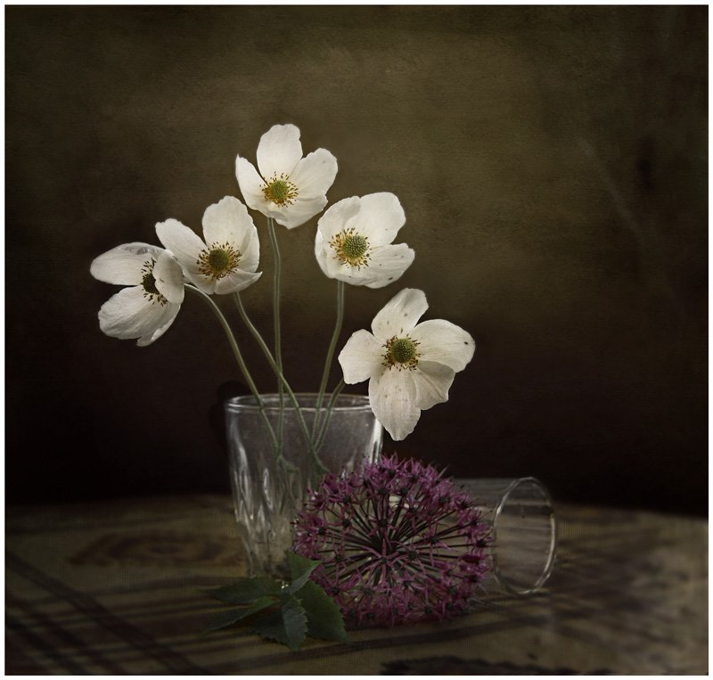 Да, они всю зиму пролежали на веранде, а потом мой младший братик нарвал для мамы цветы и поставил в этот стакан прямо без воды. А я увидела это и сняла, мне показалось интересна эта композиция, так что работа в соавторстве с трехлетним Родином:)