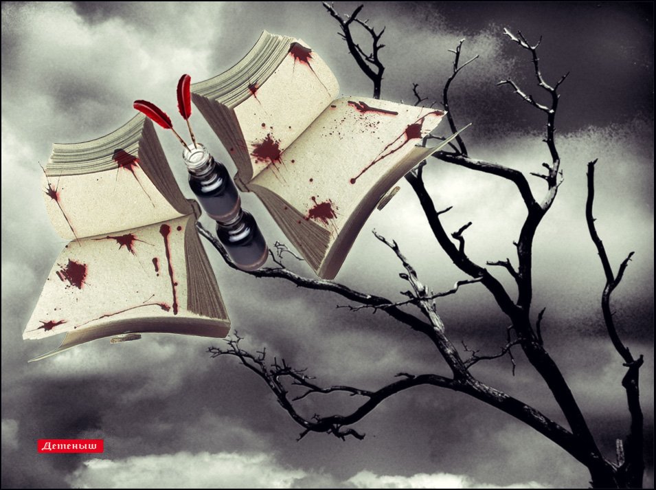 Недоработанный колаж. Книги потеряли объемность, капли красного цвета наложены как буд-то просто приклеены. Нет взаимосвязи объектов в кадре. Дерево само по себе, книги сами, даже пятна отдельно как-то. Хотя задумка наверное была интересная, но я ее не вижу.