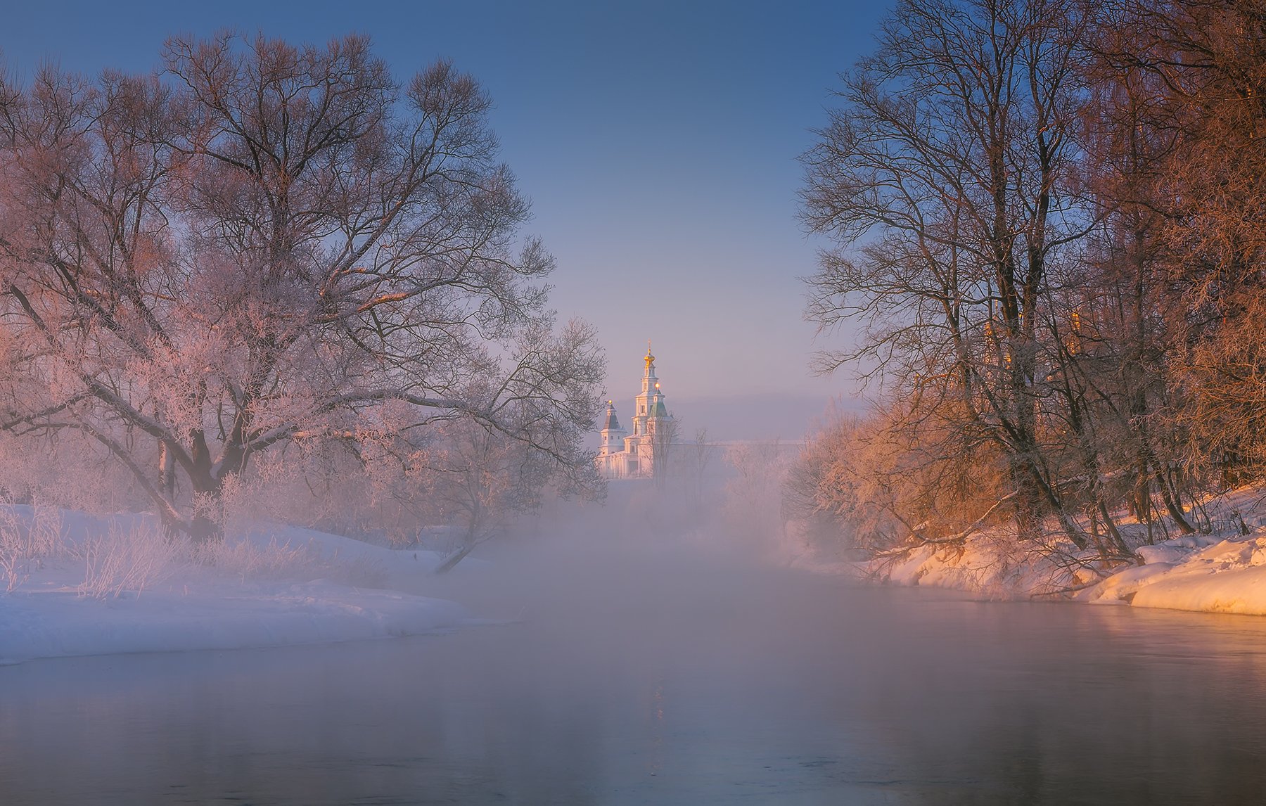 россия, монастырь, природа, утро, туман, иней, рассвет, река, пезаж, Виталий Левыкин