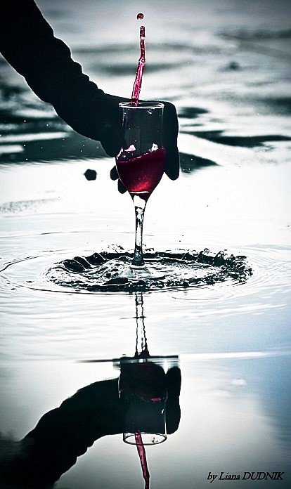 Ощущение такое: что человек резко ставит бокал вина на водную гладь, как бы отказываясь от алкоголя... то ли в пользу воды (её тут много и ощущение что она чистая), то ли перепил и ему стол мерещится водной гладью...