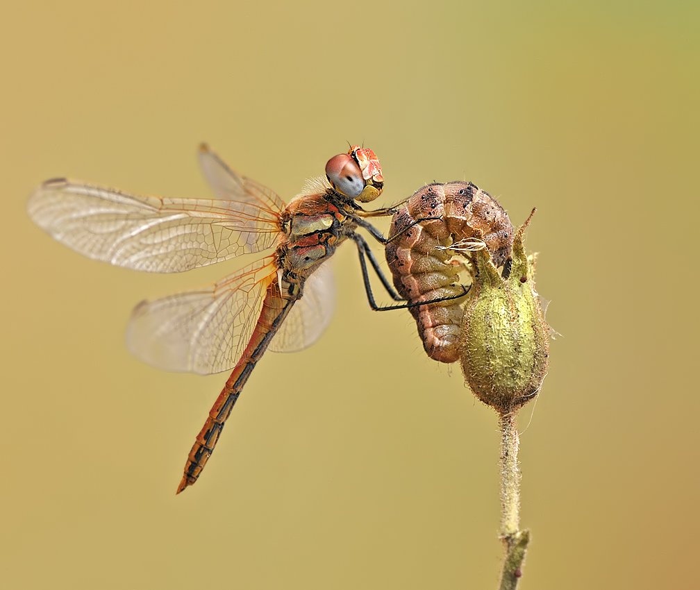 Утром стрекозы малоактивны. Подсадить сонную стрекозу на нужное растение или, к примеру, гусеничку, не составляет труда. Монтаж занимает, наверняка, больше времени :)