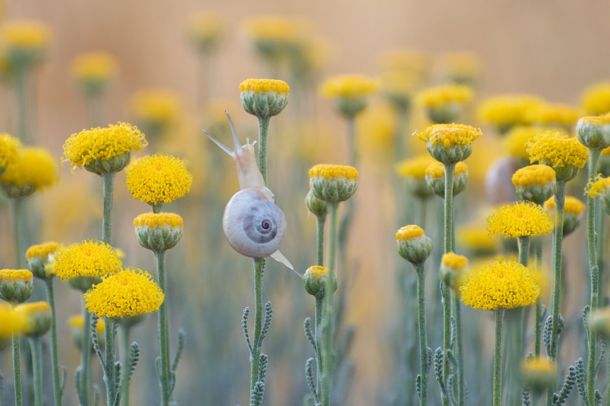 В тёплом свете раннего утра улитка, словно маленький исследователь, вьётся по стеблю среди пышных желтых цветов. Каждый цветок — как огонёк в зелёной сказке, а улитка — живое дыхание природы. Снимок передаёт тишину и умиротворение, когда мир только просыпается. Макро-фотография подчёркивает детали: текстура раковины, нежность лепестков, игру света. Это мгновение, застывшее в кадре, — символ начала, пробуждения и незаметных, но важных процессов в природе.